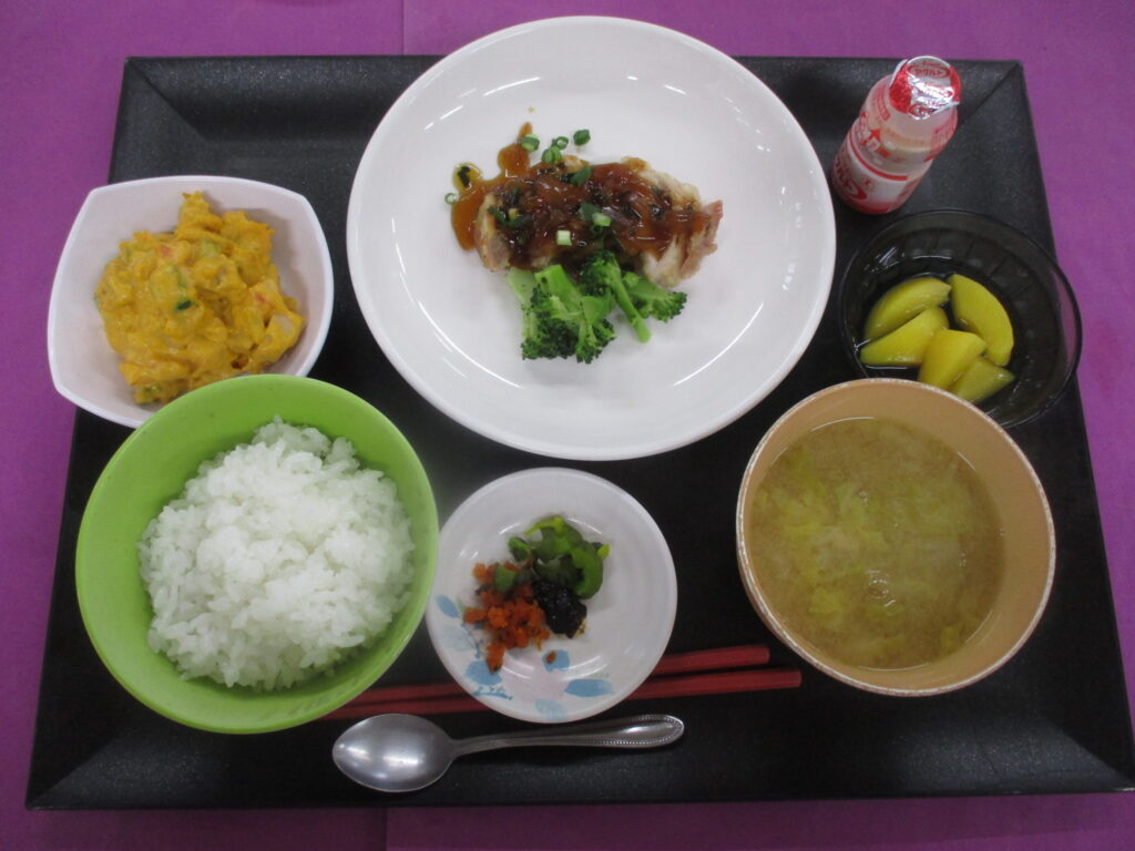 チキンソテー照り焼きソース 南瓜サラダ ご飯 味噌汁 漬物 果物🍒🍒🍒