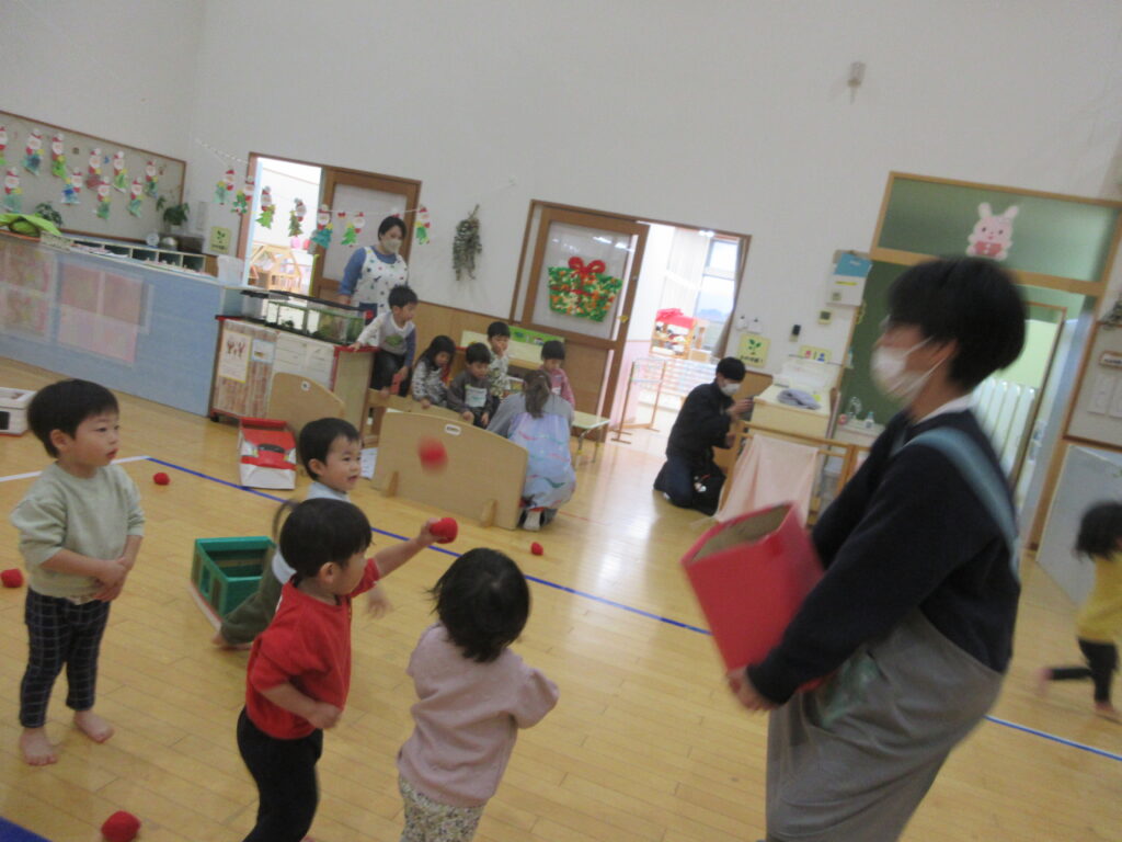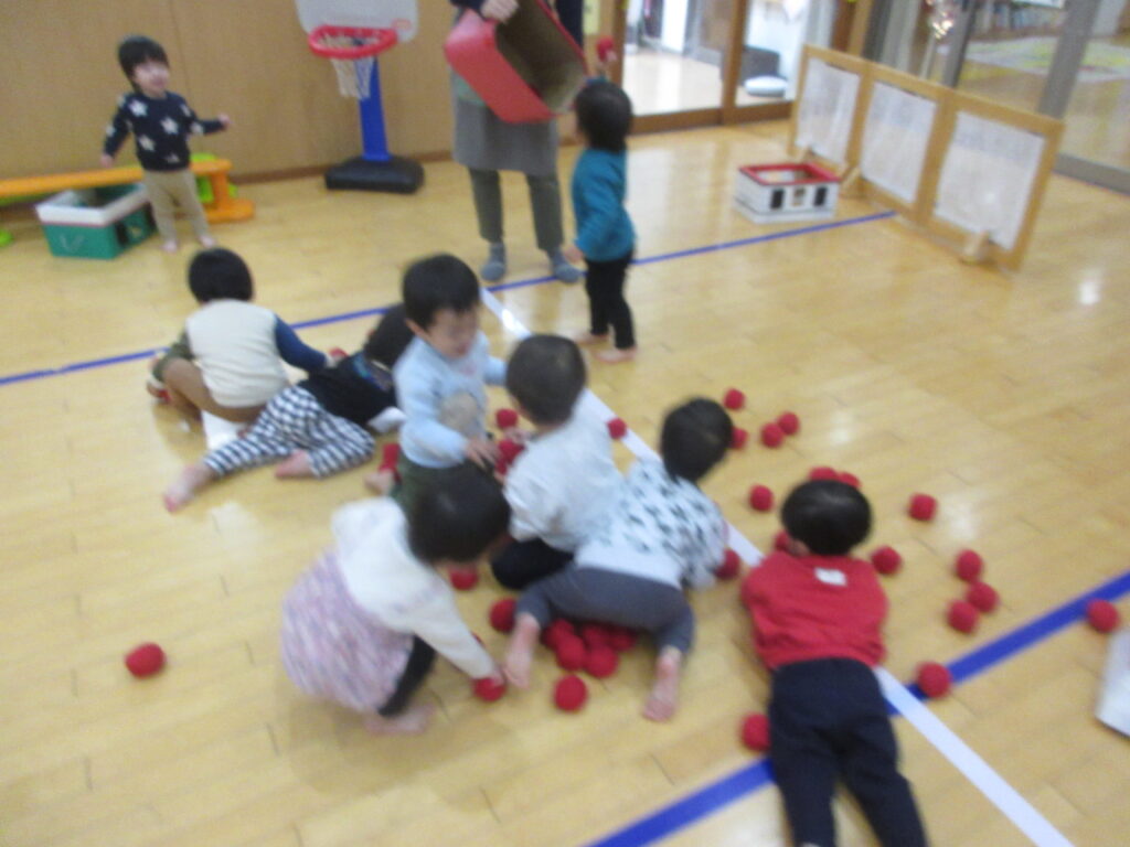 先日、初めて玉入れの玉を使って遊びました!保育者がカゴを持って逃げると、落ちている玉を上手に拾って「待て~!」と追いかけ、一生懸命投げていました💪🏻