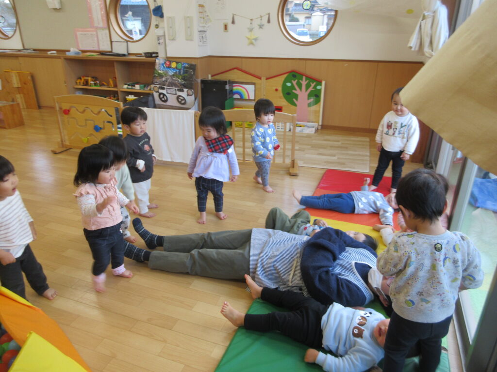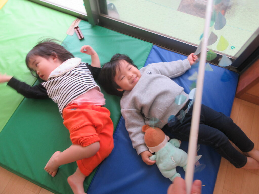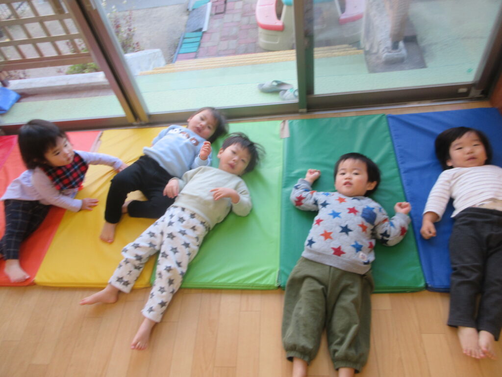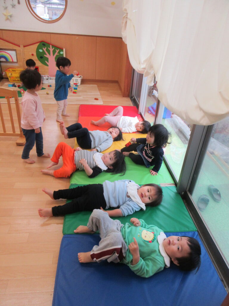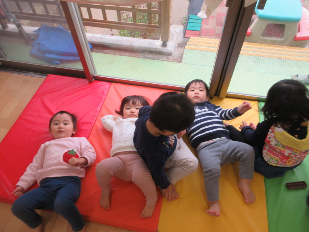 マットを敷くと気持ちよさそうに子どもたちが寝転んでいました。