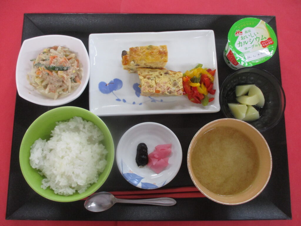 五目卵焼き ツナサラダ ご飯 味噌汁 漬物 果物🥝🥝🥝