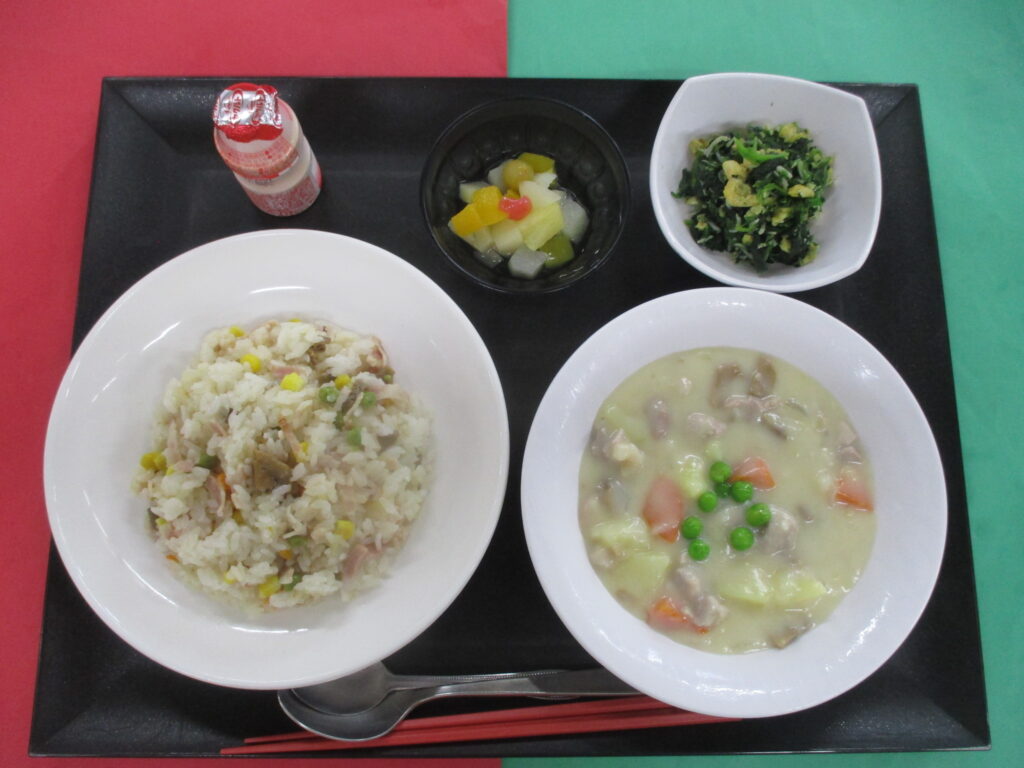 🎄クリスマスイブ🎄 ピラフ クリームシチュー 青菜のしらす和え 果物🍑🍑🍑