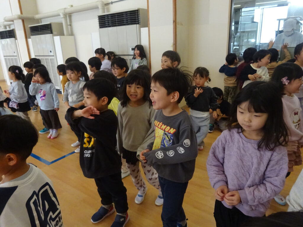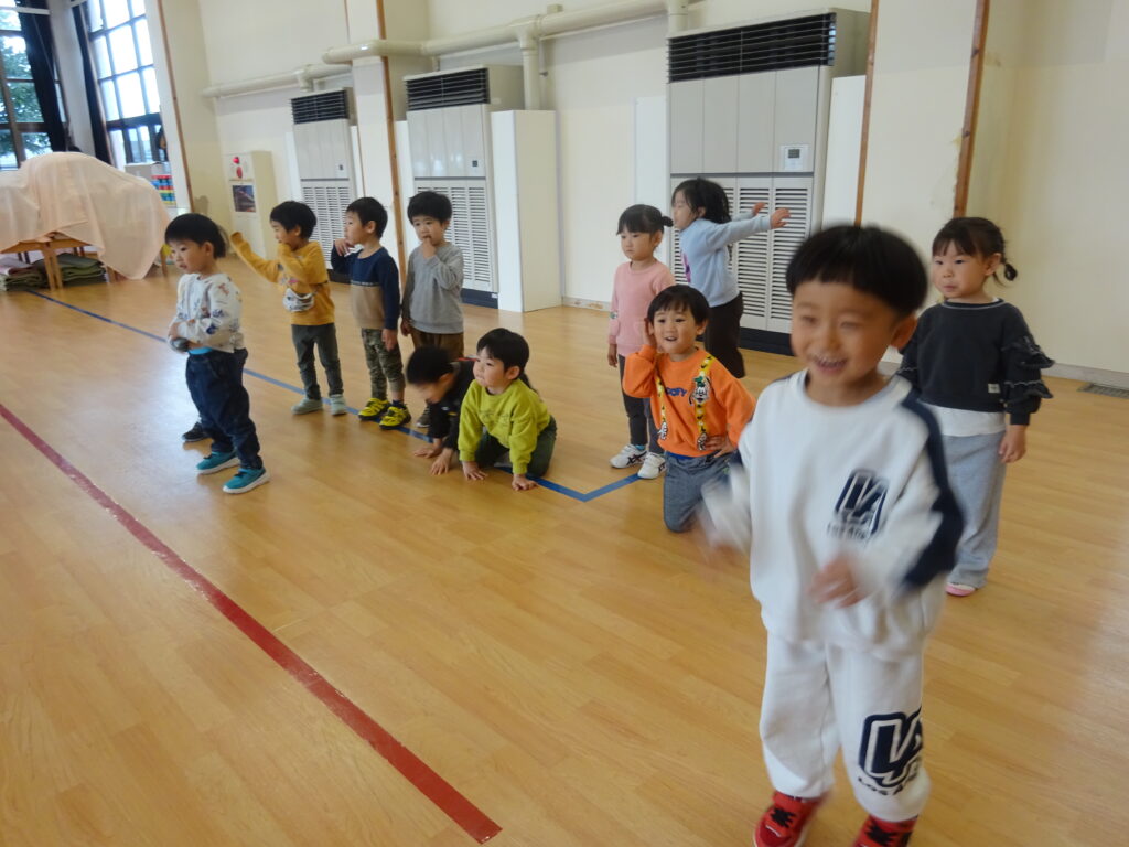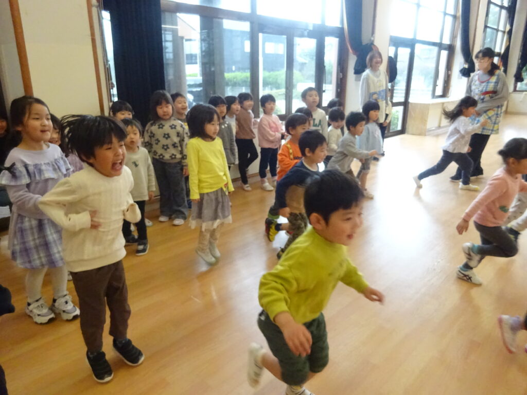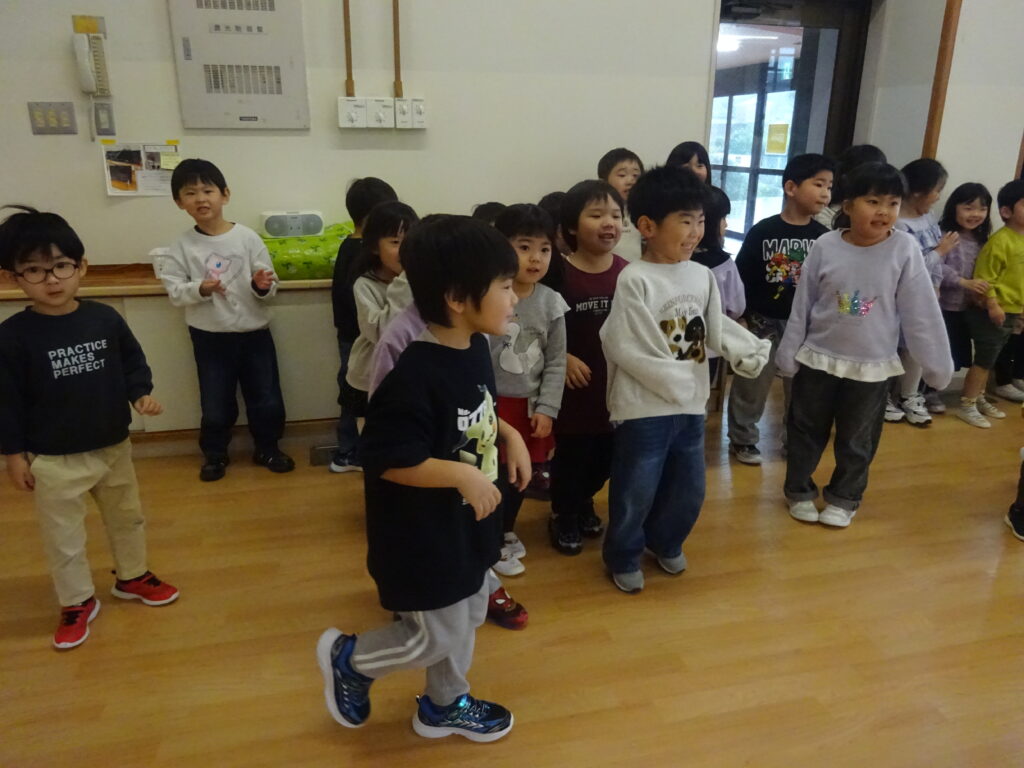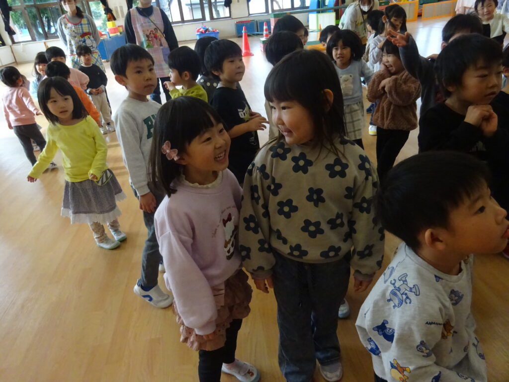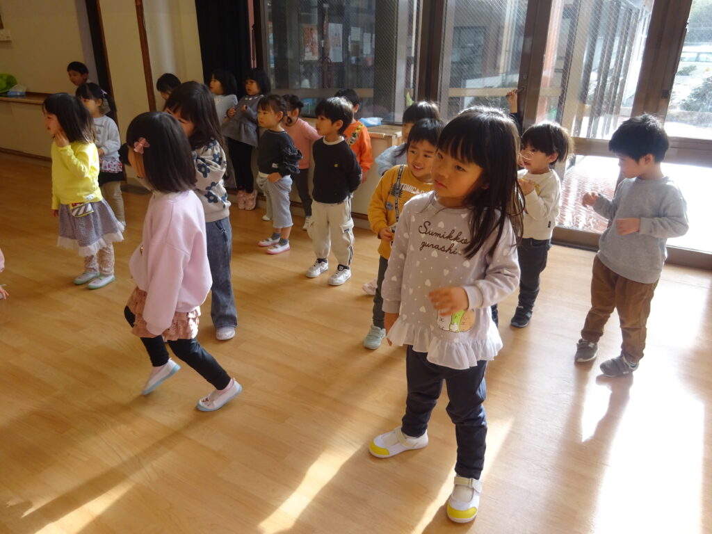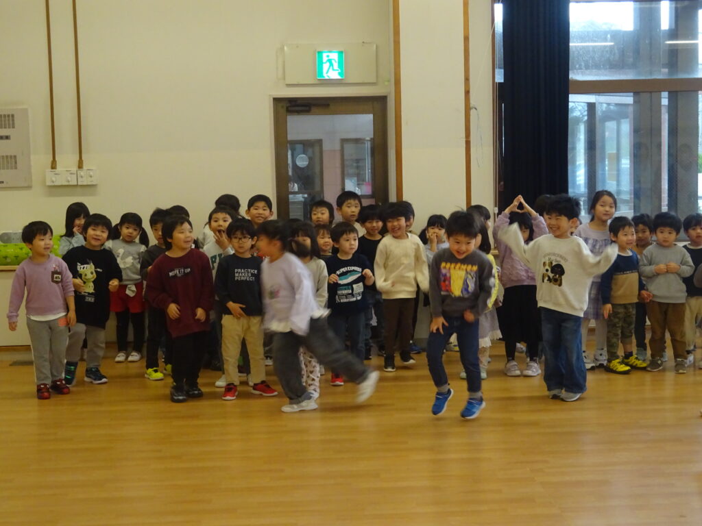 クイズをよく聞いて〇✖の方向にしっかり動き、ゲームに参加していました。壁までぺったりとくっつく様子がかわいく、節分の時以来かな?という子どもたちの姿に思わず笑ってしまいました。