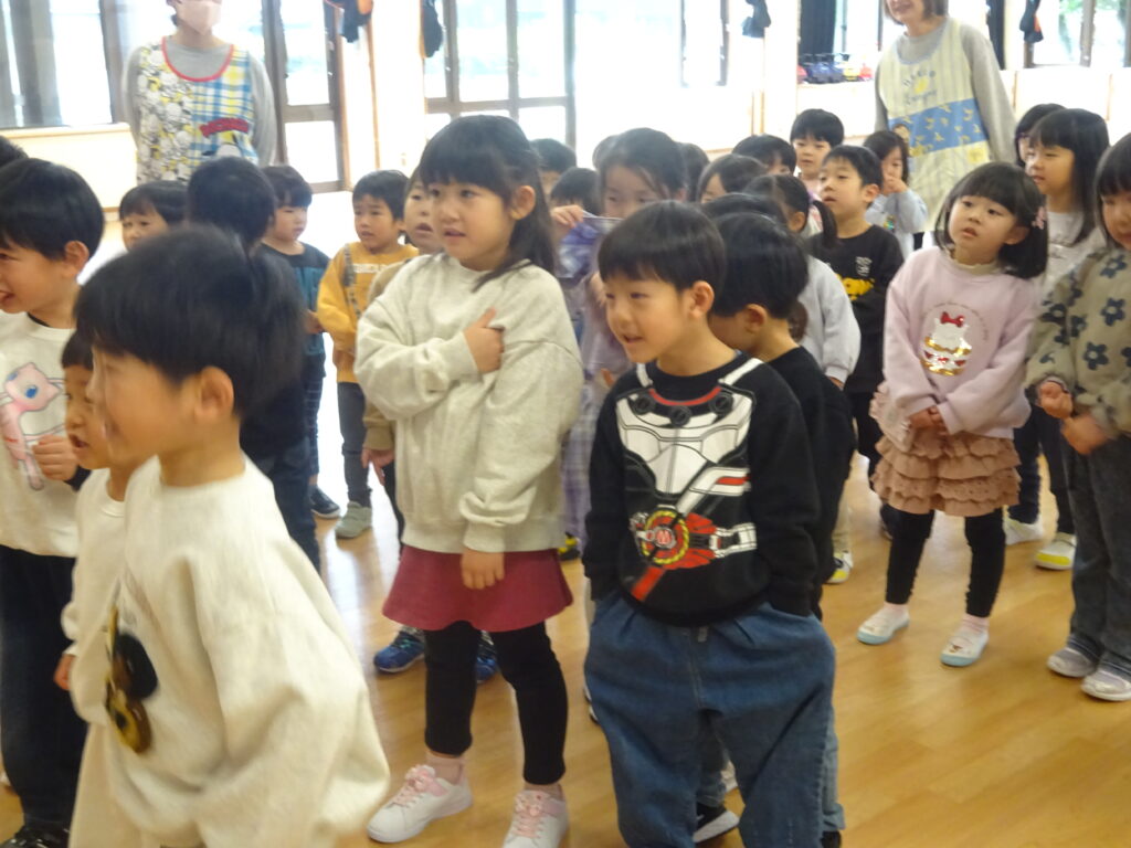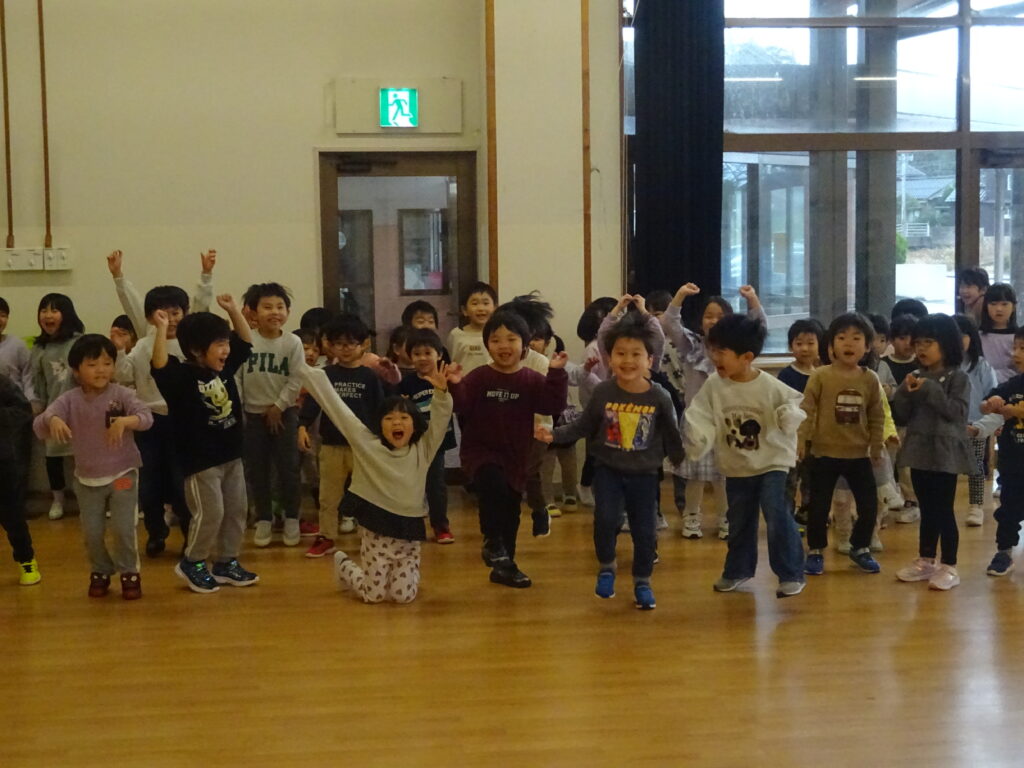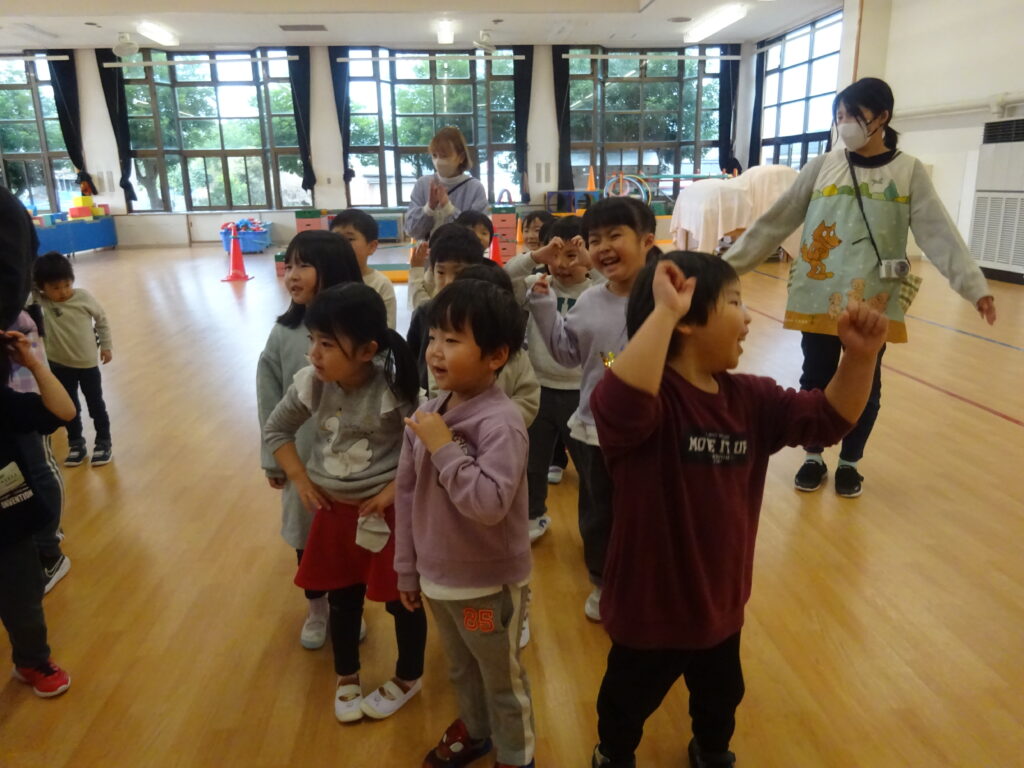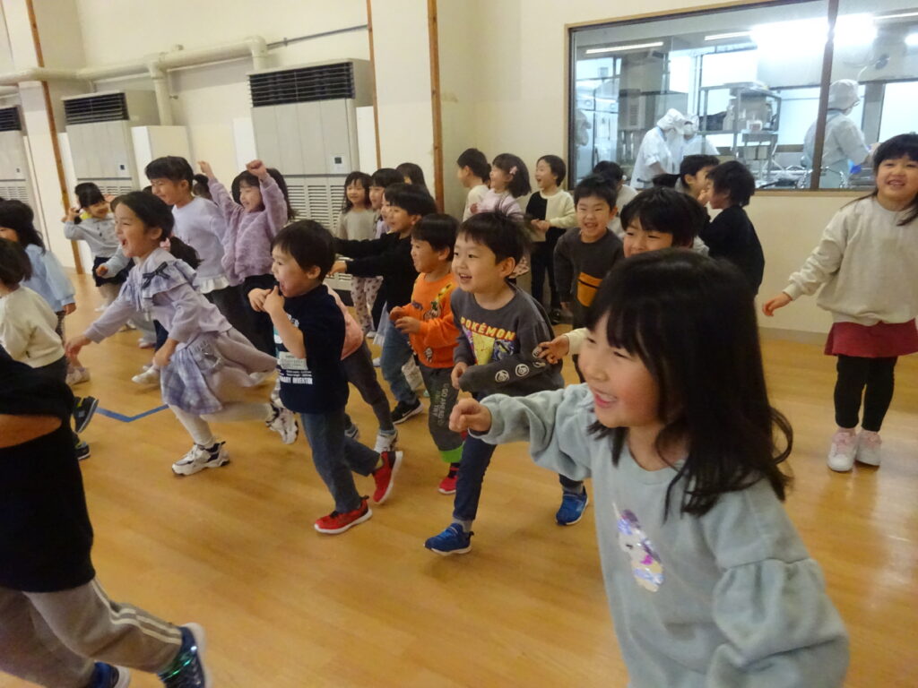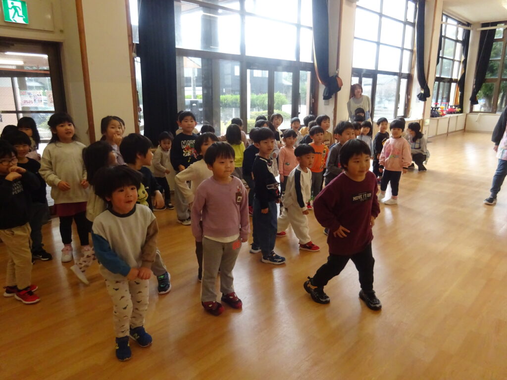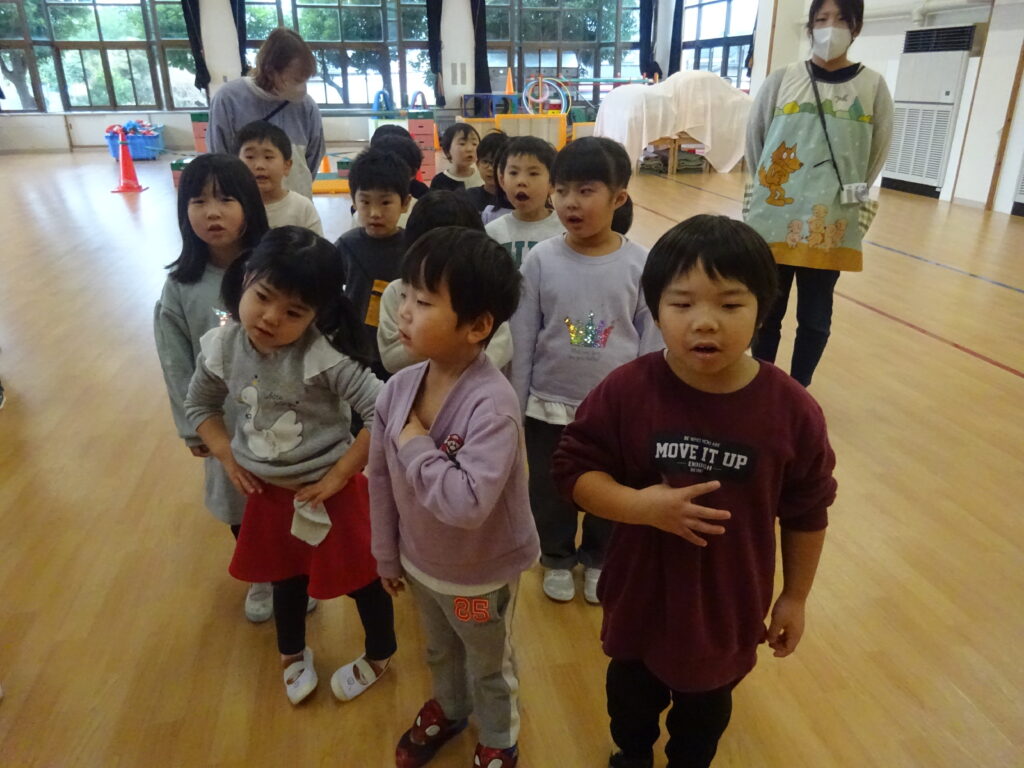 クイズをよく聞いて〇✖の方向にしっかり動き、ゲームに参加していました。壁までぺったりとくっつく様子がかわいく、節分の時以来かな?という子どもたちの姿に思わず笑ってしまいました。