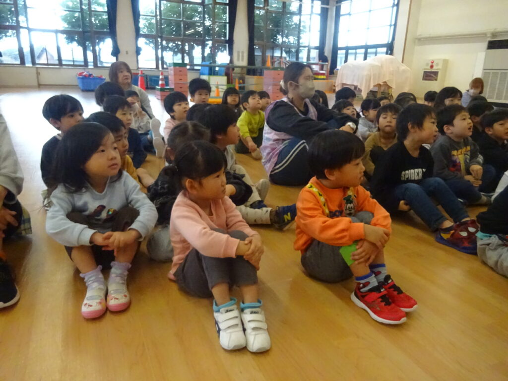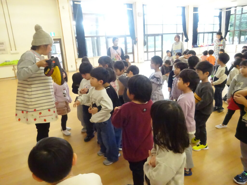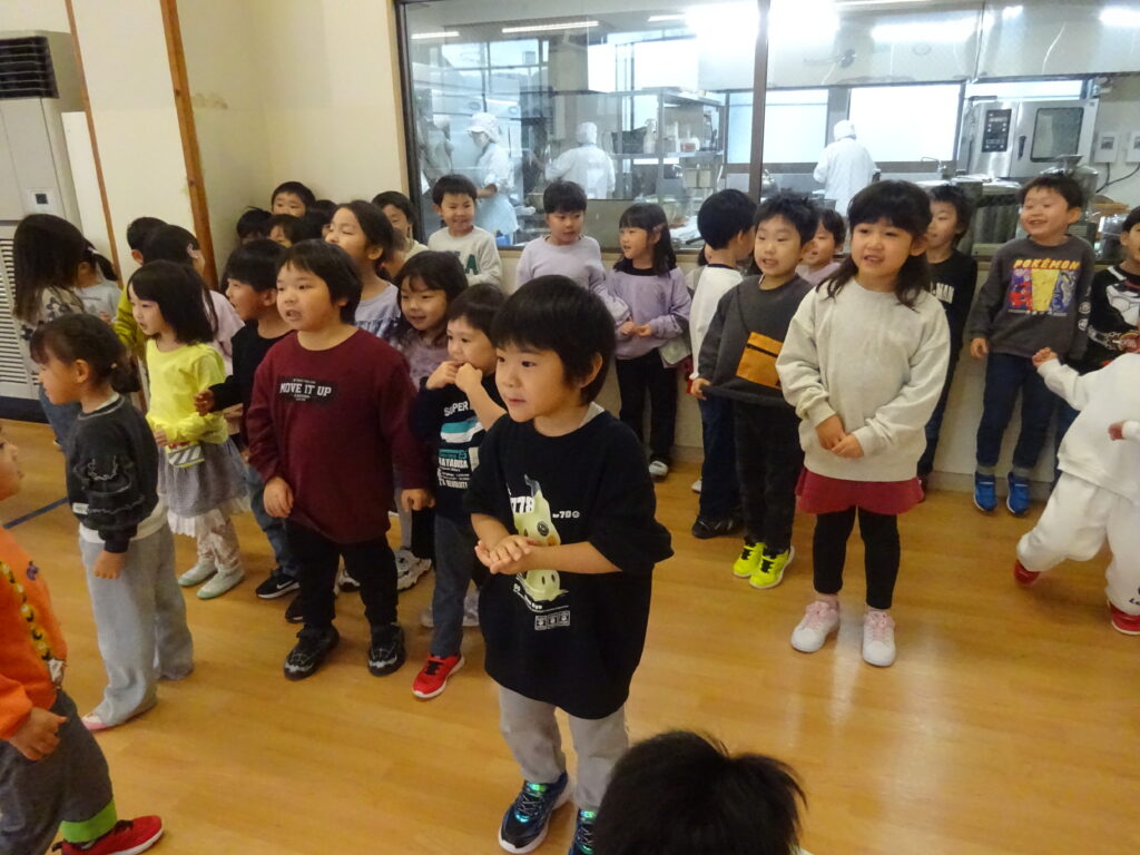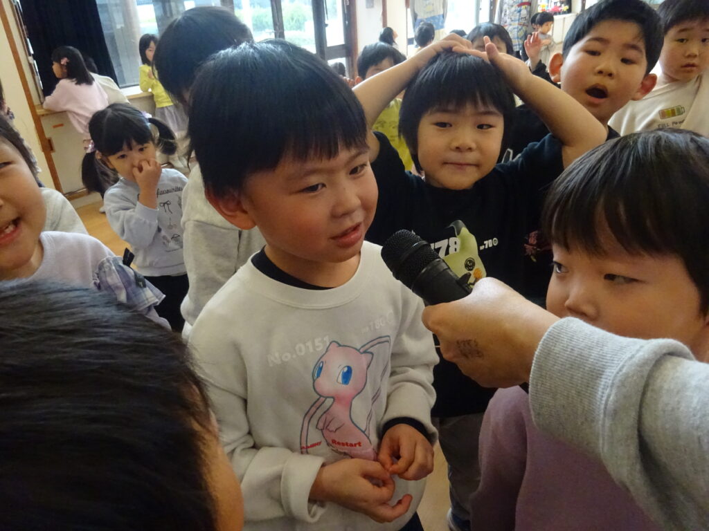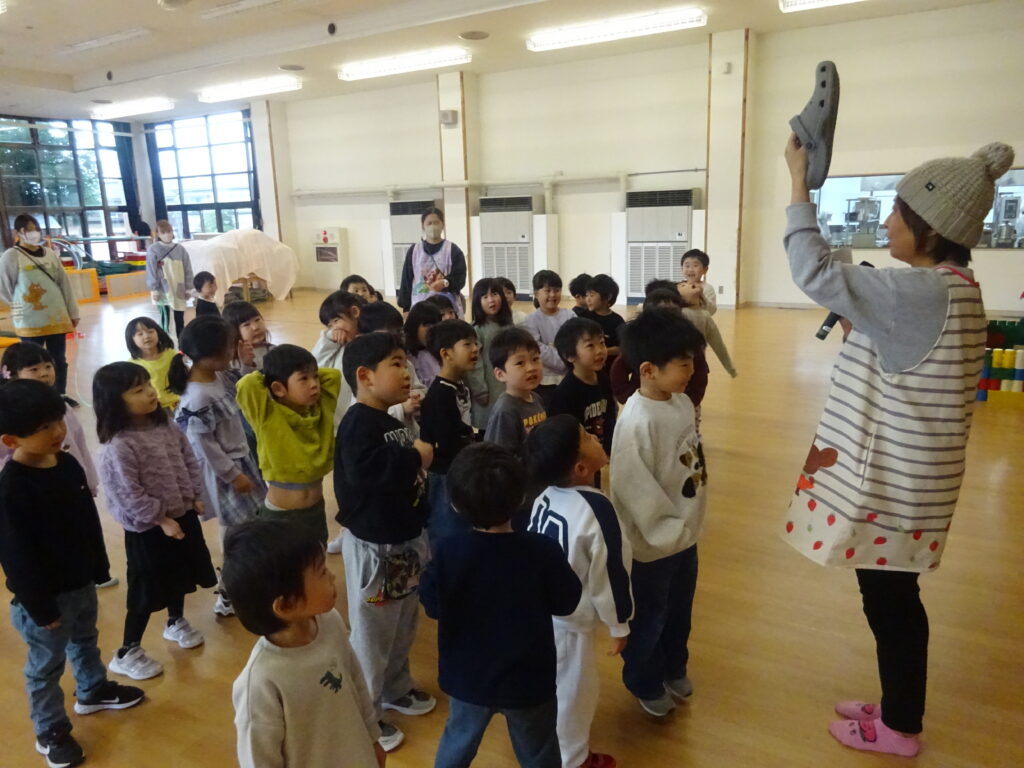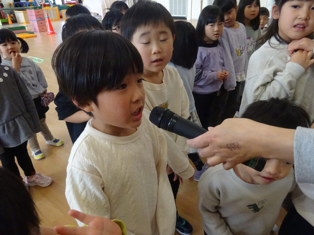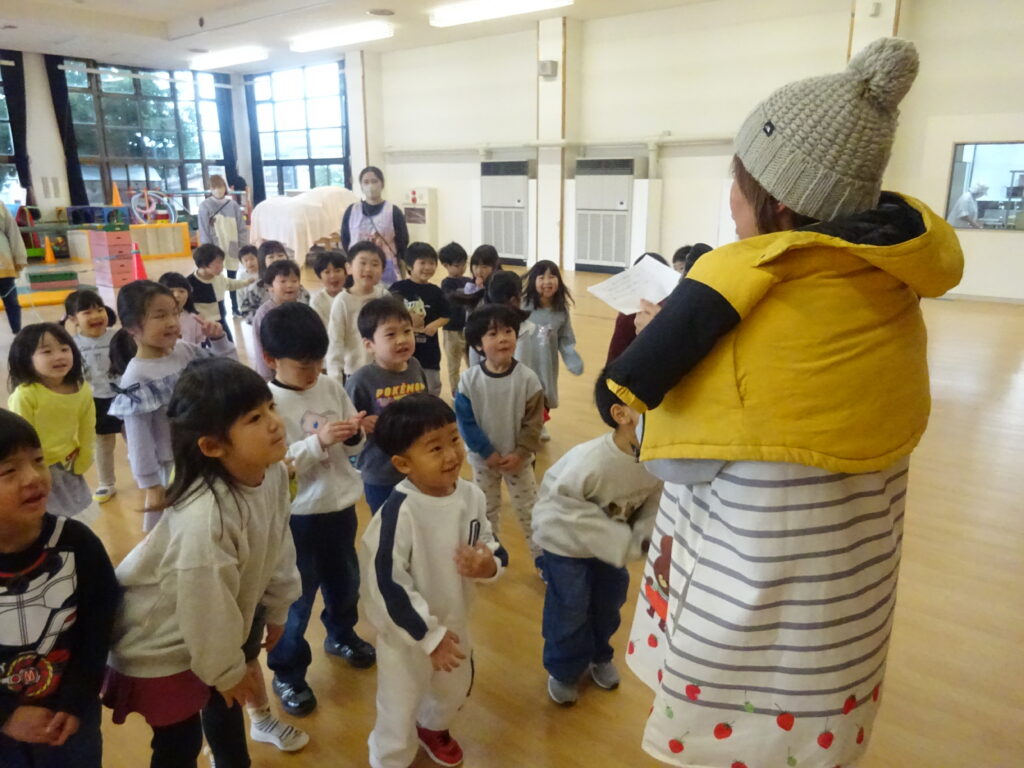 クイズをよく聞いて〇✖の方向にしっかり動き、ゲームに参加していました。壁までぺったりとくっつく様子がかわいく、節分の時以来かな?という子どもたちの姿に思わず笑ってしまいました。