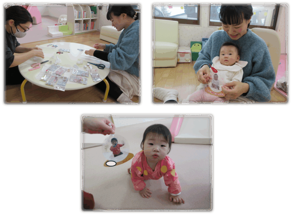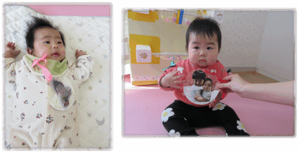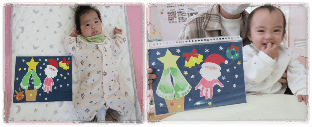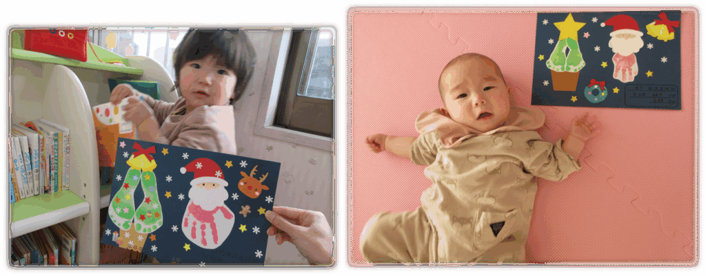 身長・体重を計測でき、お子さんの手形や足形を使って可愛らしいアートを毎月作成し、思い出をアルバムのように綴っていきます。毎月デザインが変わるため、1枚1枚とても可愛らしい素敵な作品に仕上がります。様子をお知らせします♪