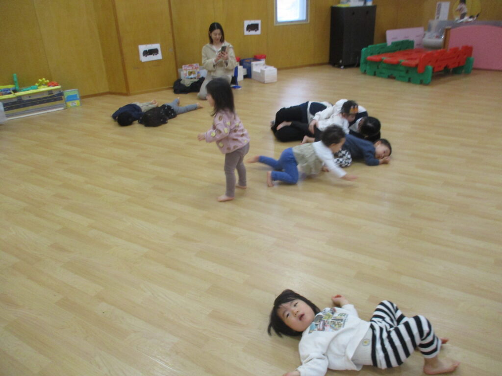 リトミック遊びで音に合わせて回ったり、ジャンプをしたり、寝ころんだり・・・。その他にも動物かけっこや、かくれんぼをして遊びました。