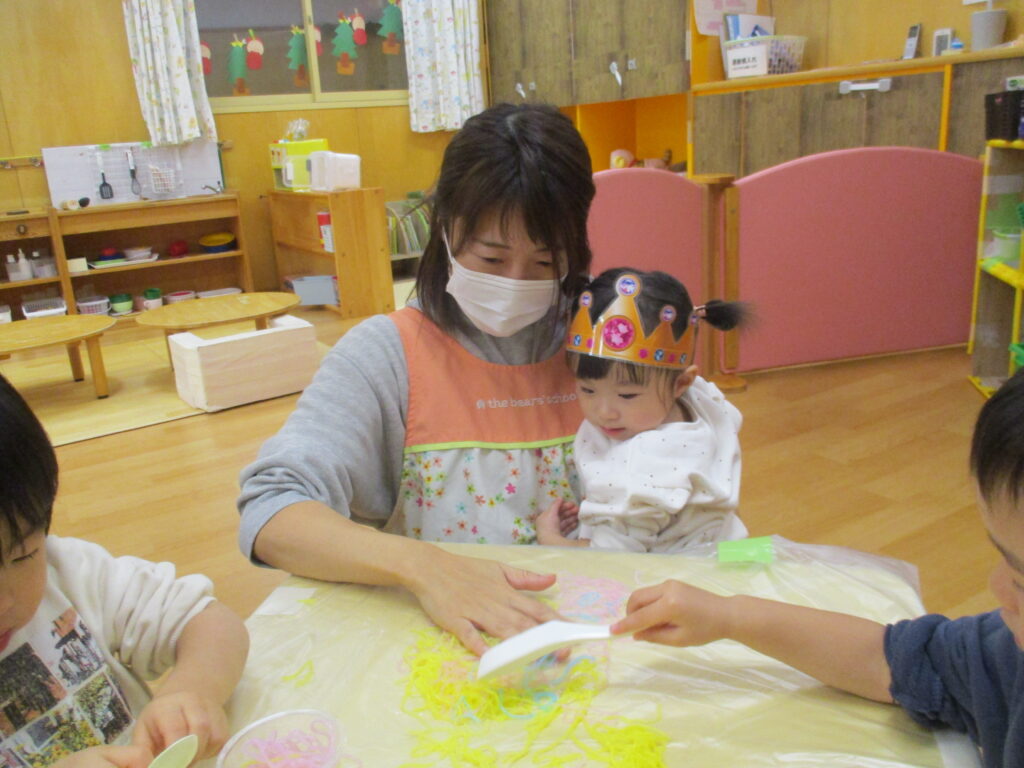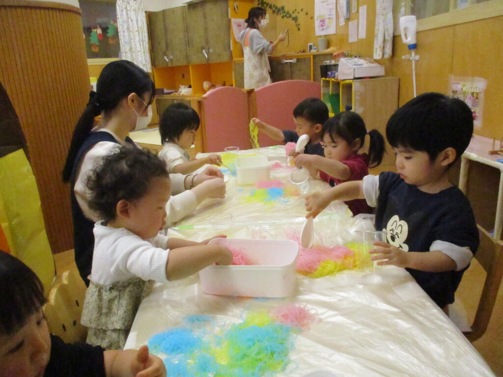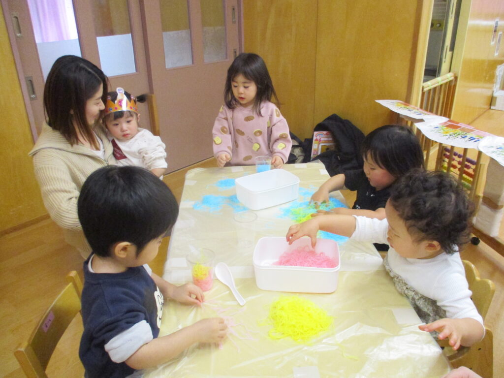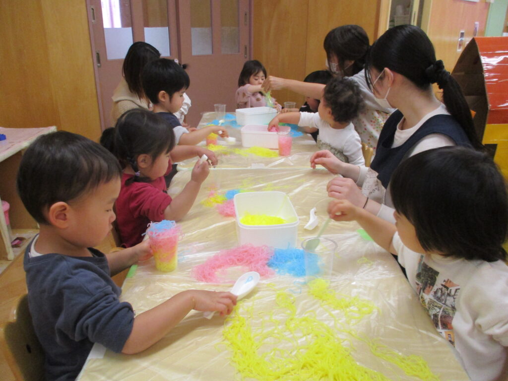 お部屋では、色の付いた春雨を使って感触遊びを楽しみました。