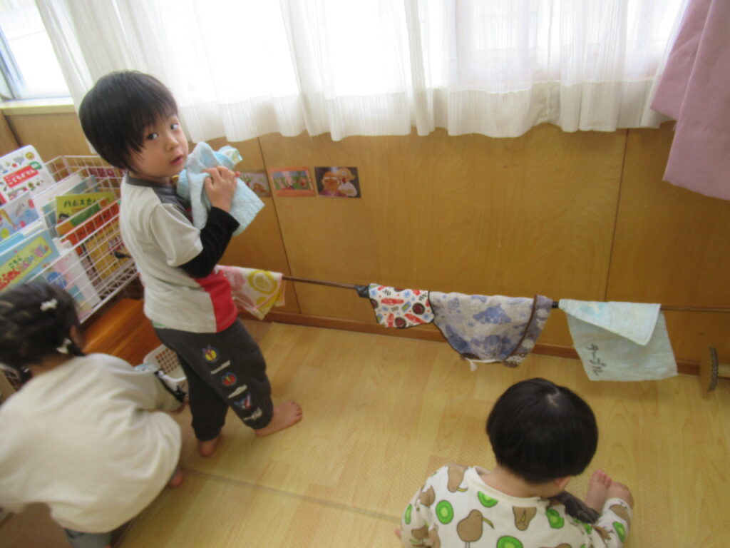 エアコンをつけてお部屋を暖かくしたりと、使い方を教えなくても、ママやパパが普段やっているところをよく見ているからでしょうか。自然と使い方が分かり、「掃除機は端までやるんだよね!」「洗濯物干すね!」と家事上手なたんぽぽ組でした😊