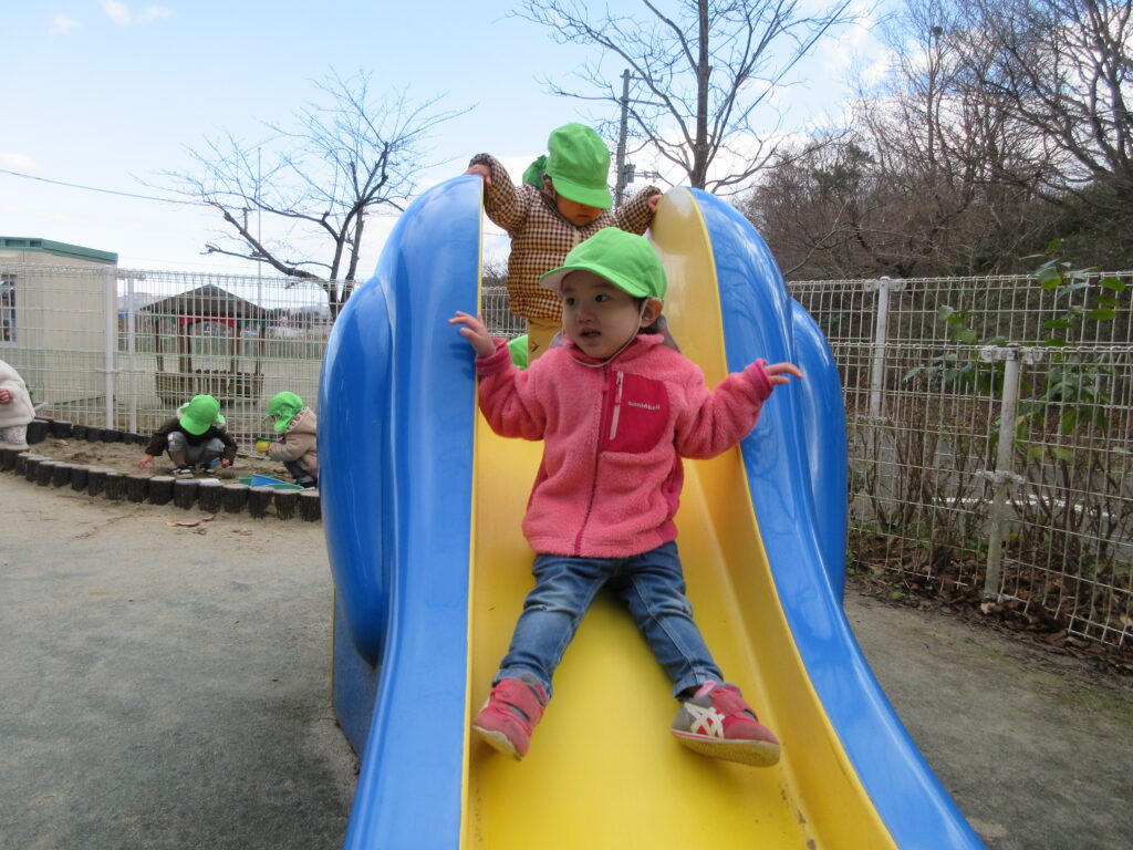 滑り台では、「◯◯ちゃん待って~!」と保育教諭に見守られながら繰り返し遊んでいることで「前の友達が滑り終えてから滑る」というルールを守って気持ちよく楽しく遊べるようになりました。