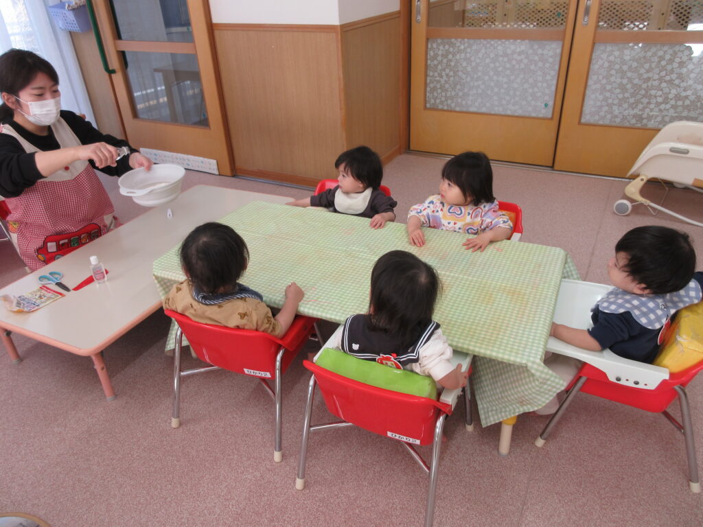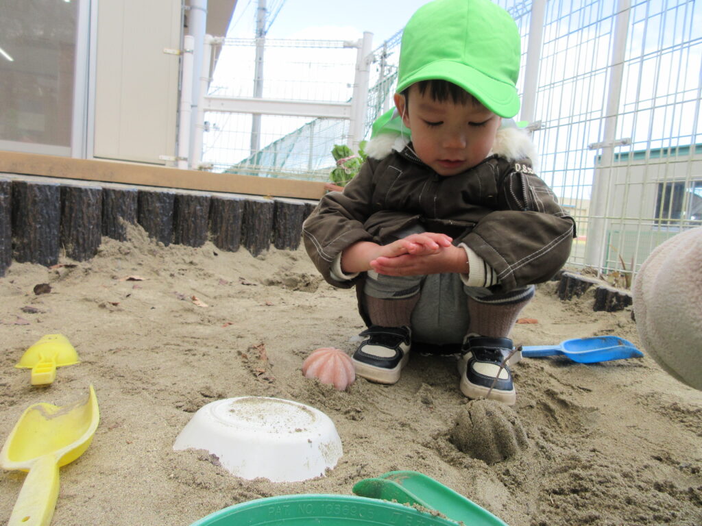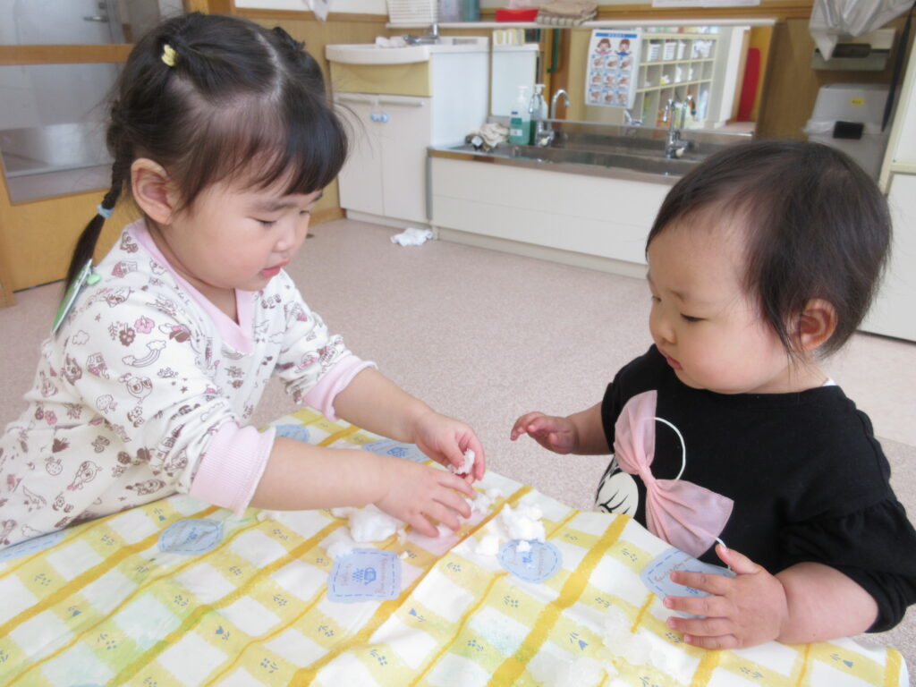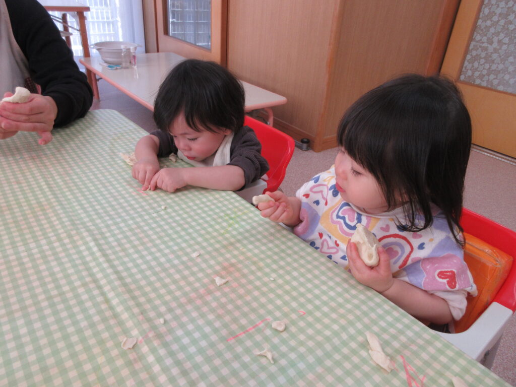この日は本園でもちつき会があったので、分園でも小麦粉粘土遊びをして雰囲気を楽しみました。さらさらの小麦粉が少しずつ固まっていく様子に興味津々の様子です。担任の真似をして伸ばしたりちぎったりと指先を使って感触遊びを存分に楽しみました。