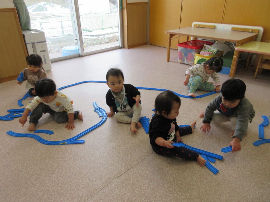 玩具の遊び方や友達との関わり方が少しずつ上手になり、友達の存在を意識することができるようになった1歳児クラス。プラレール遊びでは、子ども達と担任で力を合わせて大きな線路を作ることが出来ました。線路が長い分、作りきった達成感を味わいながら集中してお気に入りの列車を走らせていました。