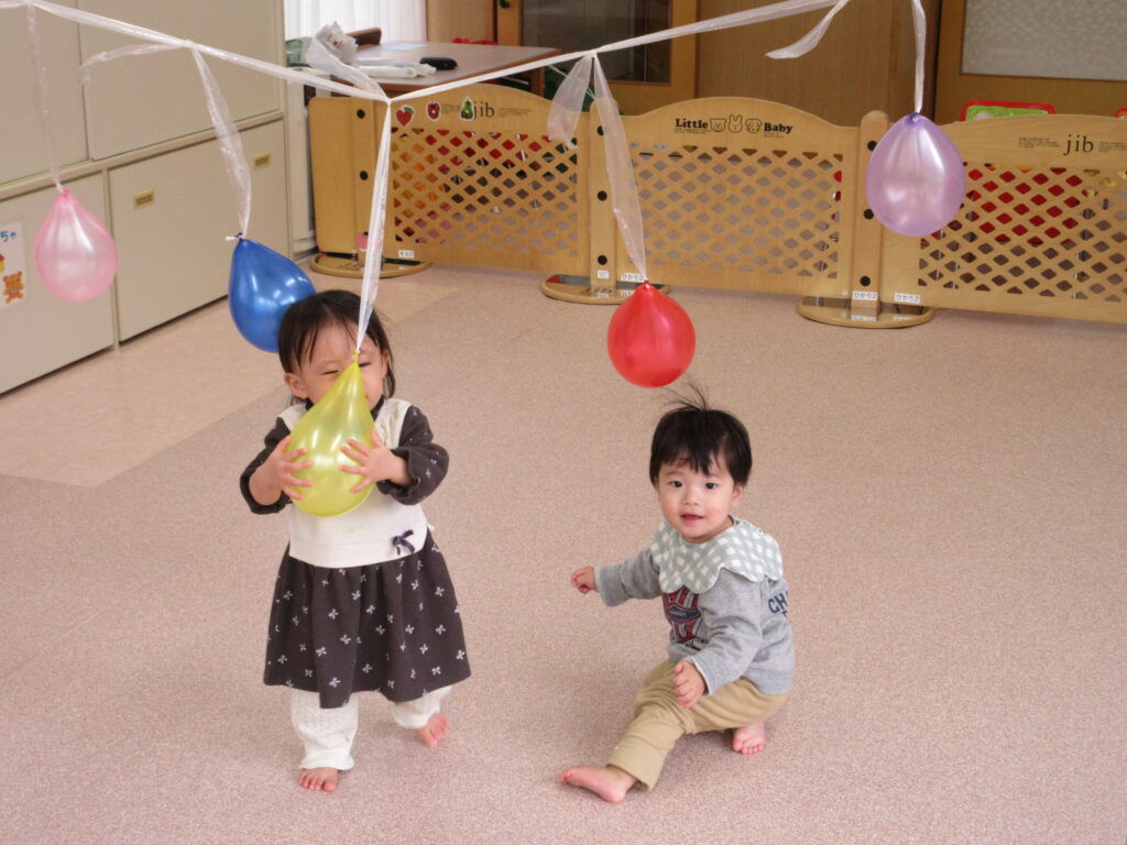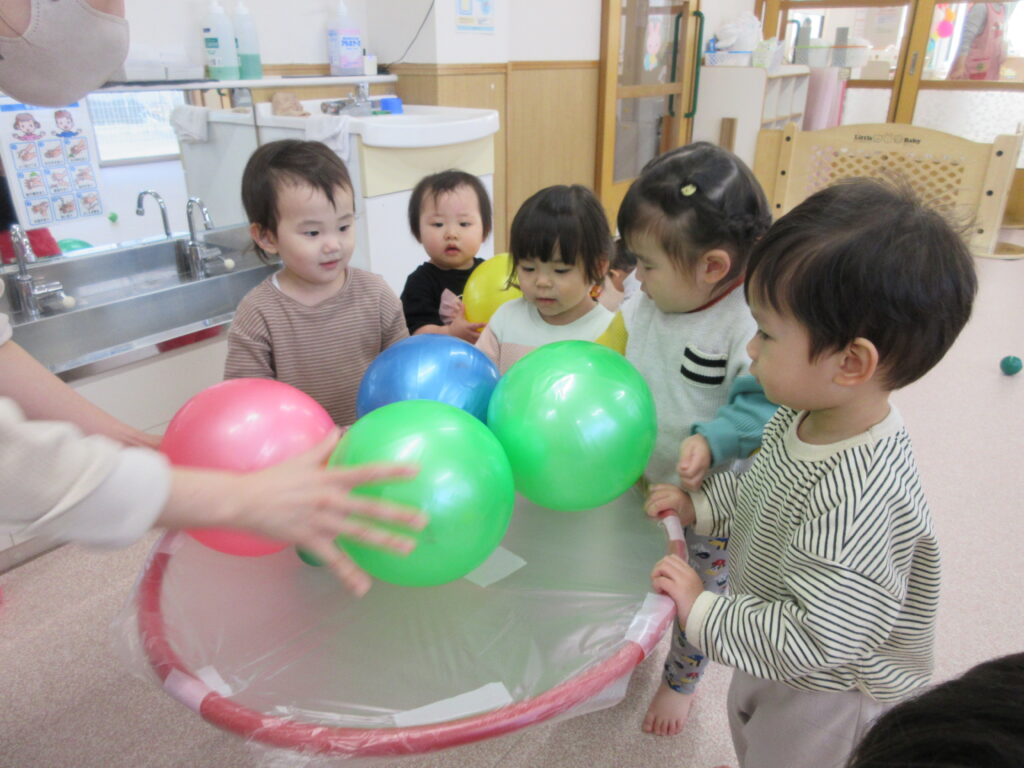 風船遊びでは、感触を楽しんだり、自分より高い位置に風船があると背伸びをして触ったりする姿が見られました。
