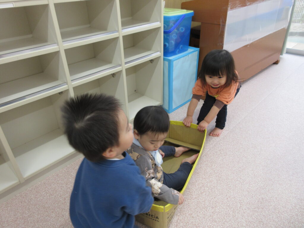 0歳児クラスと1歳児クラスで一緒に遊ぶ時には、段ボールの中に0歳児のお友達を乗せ、1歳児のお兄さん・お姉さんが散歩に連れて行ってくれたりもします。