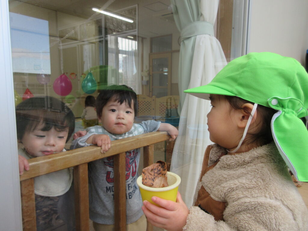 寒い日が続いていますが、太陽が顔を出し少しぽかぽかした日にはテラスで楽しく遊びました。