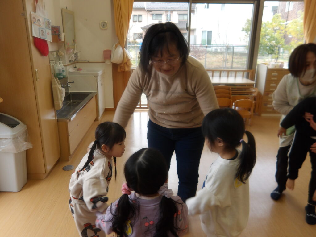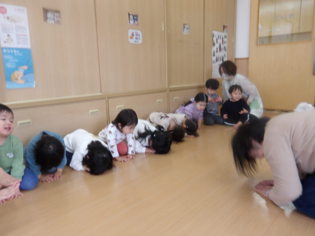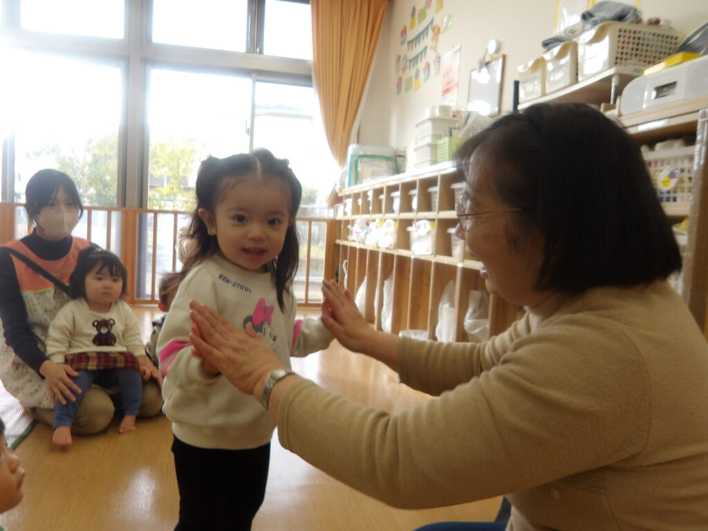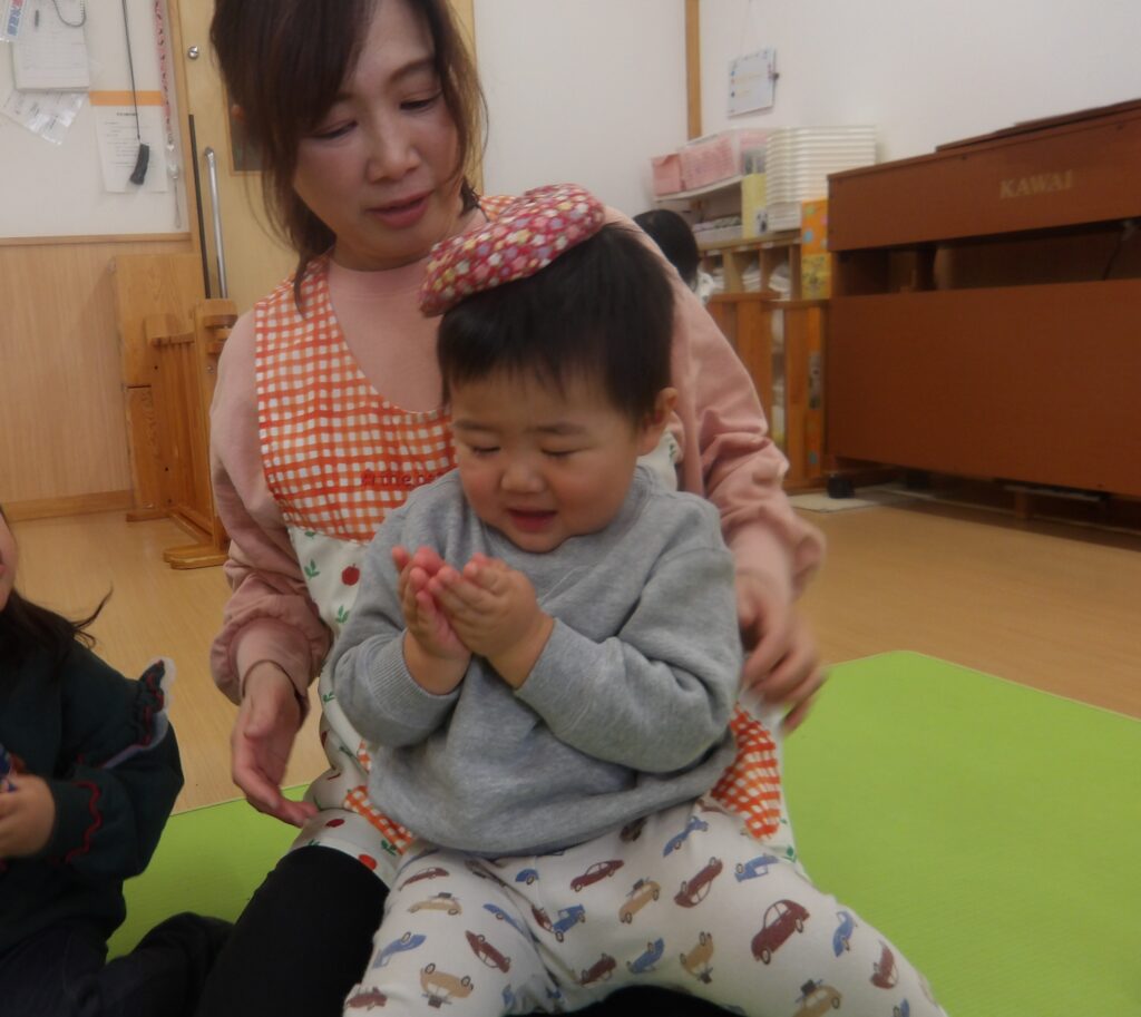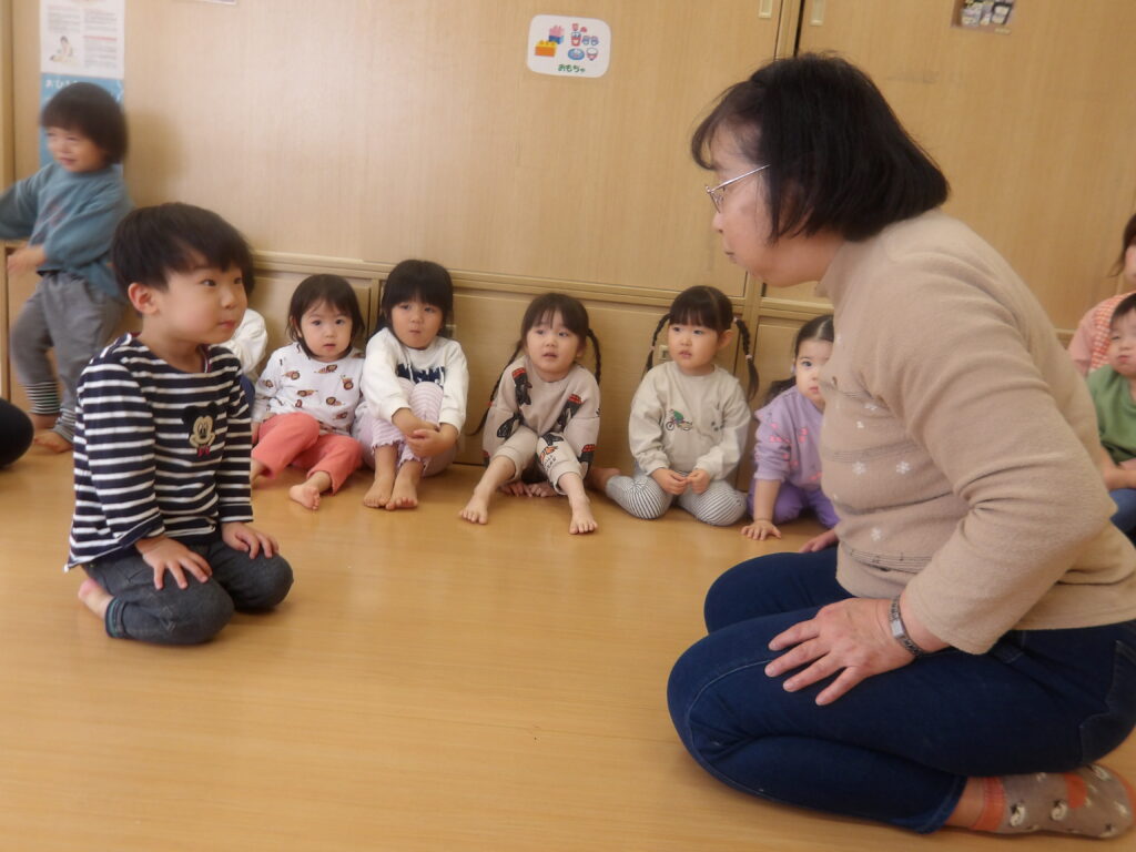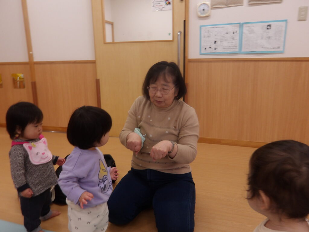 12月10日(水)に宮城わらべ歌会の小原紀子先生にわらべうたあそびを教えてもらい、一緒に遊びました。小原先生には6月に一度来て頂き、0歳児から2歳児の年齢に合わせたわらべうたを教えてもらい、子ども達と一緒に楽しんできました。今回も更に楽しいわらべうたを教わりました。