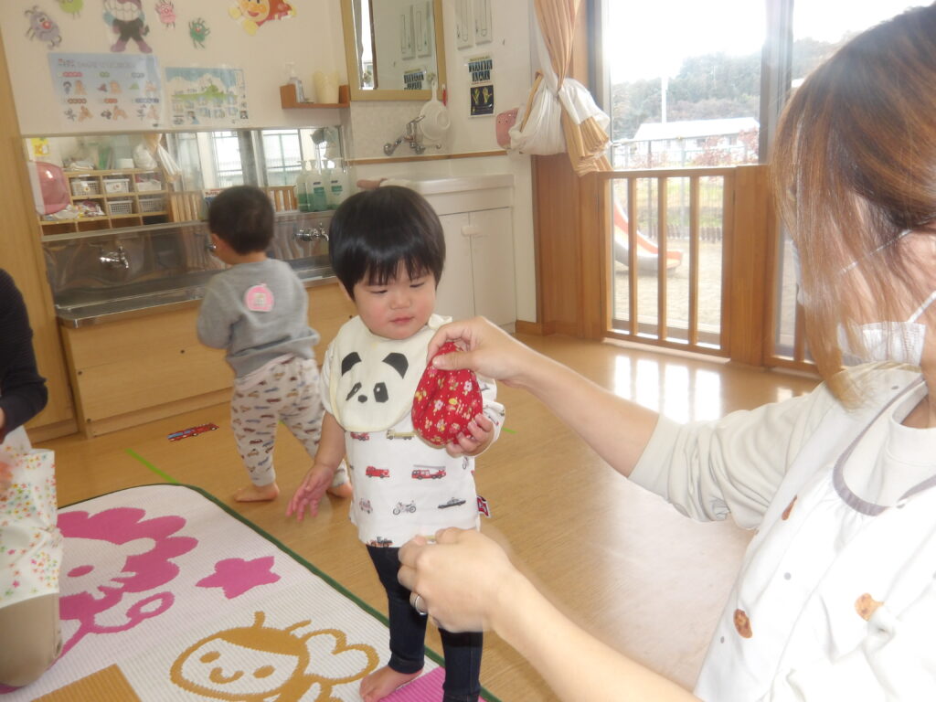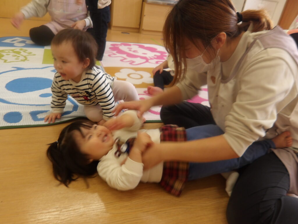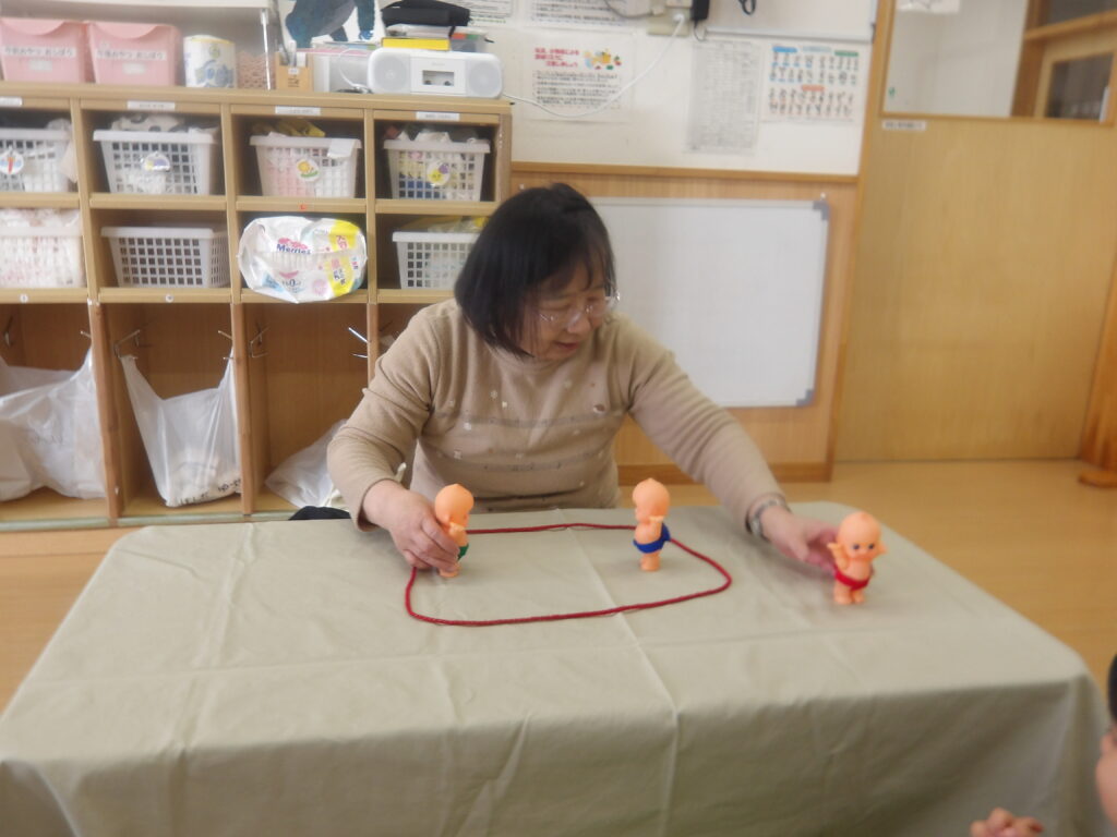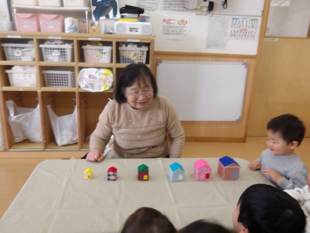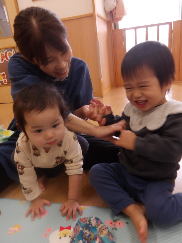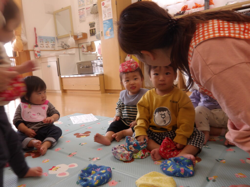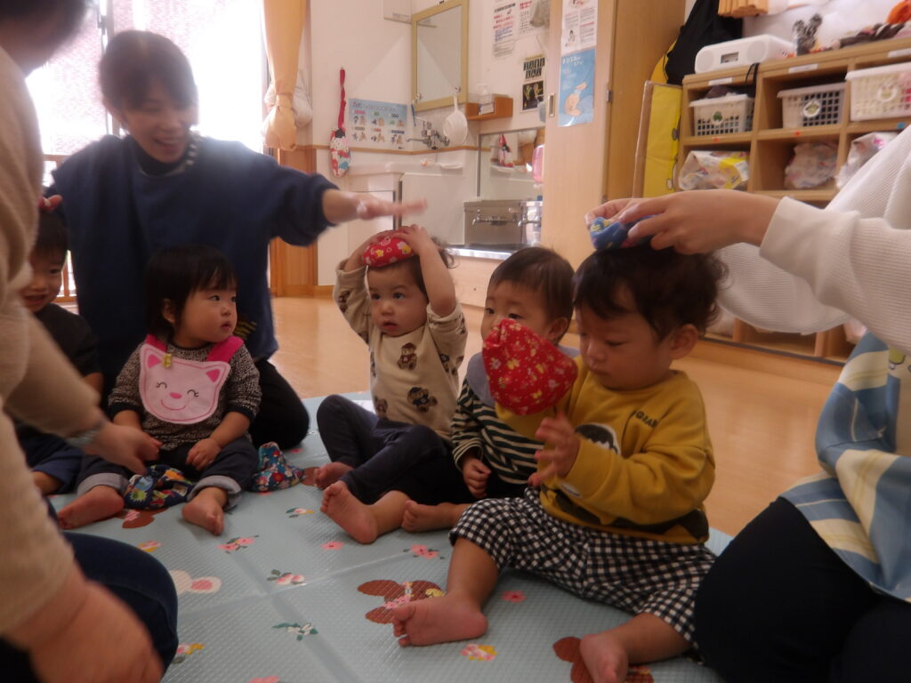 12月10日(水)に宮城わらべ歌会の小原紀子先生にわらべうたあそびを教えてもらい、一緒に遊びました。小原先生には6月に一度来て頂き、0歳児から2歳児の年齢に合わせたわらべうたを教えてもらい、子ども達と一緒に楽しんできました。今回も更に楽しいわらべうたを教わりました。