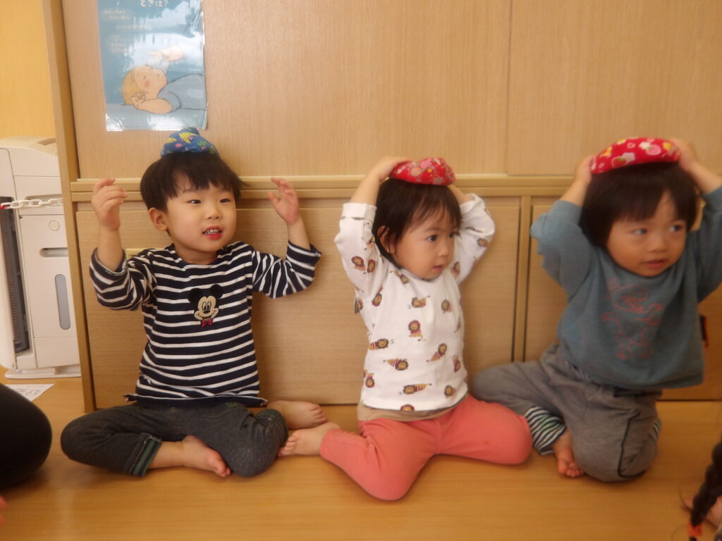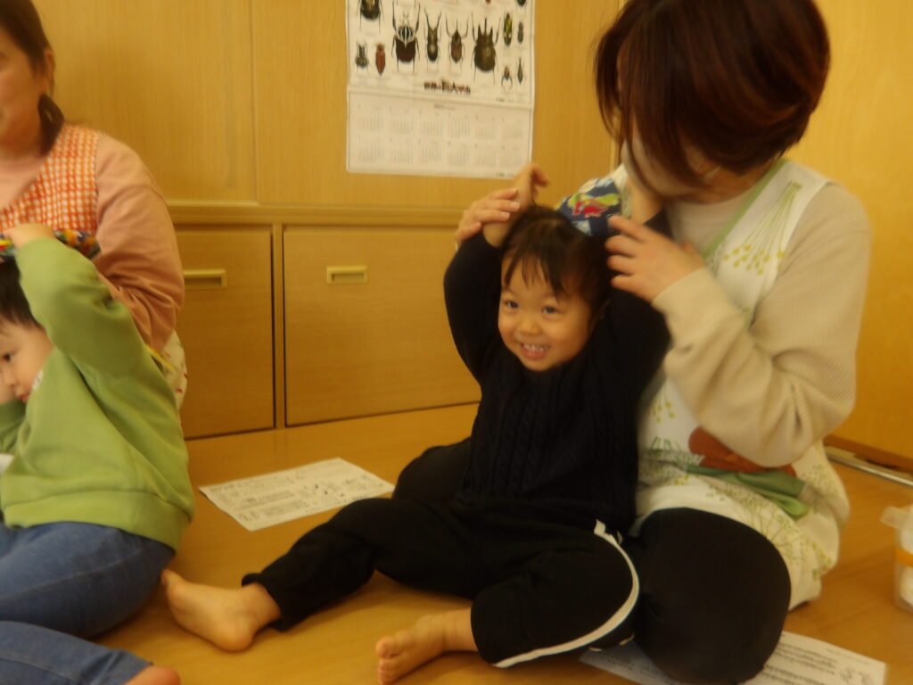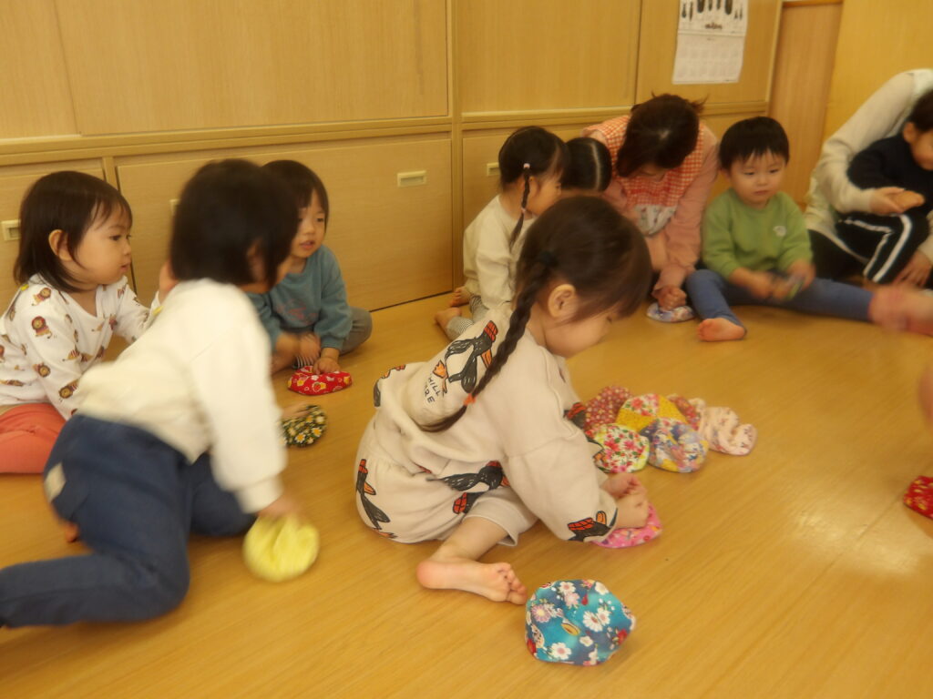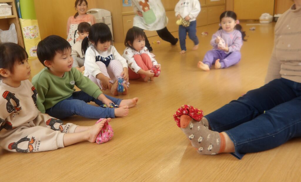 小原先生の温かい雰囲気とほっとする優しい歌に合わせてお手玉を頭に乗せておじぎをするとポトンとお手玉が下に落ちる動きに子ども達はどんどん惹きこまれていきました。私たちも小原先生と一緒に歌いながら子ども達と一緒にわらべうたを楽しむとなんともほんわかした素敵な時間を過ごすことが出来ました。