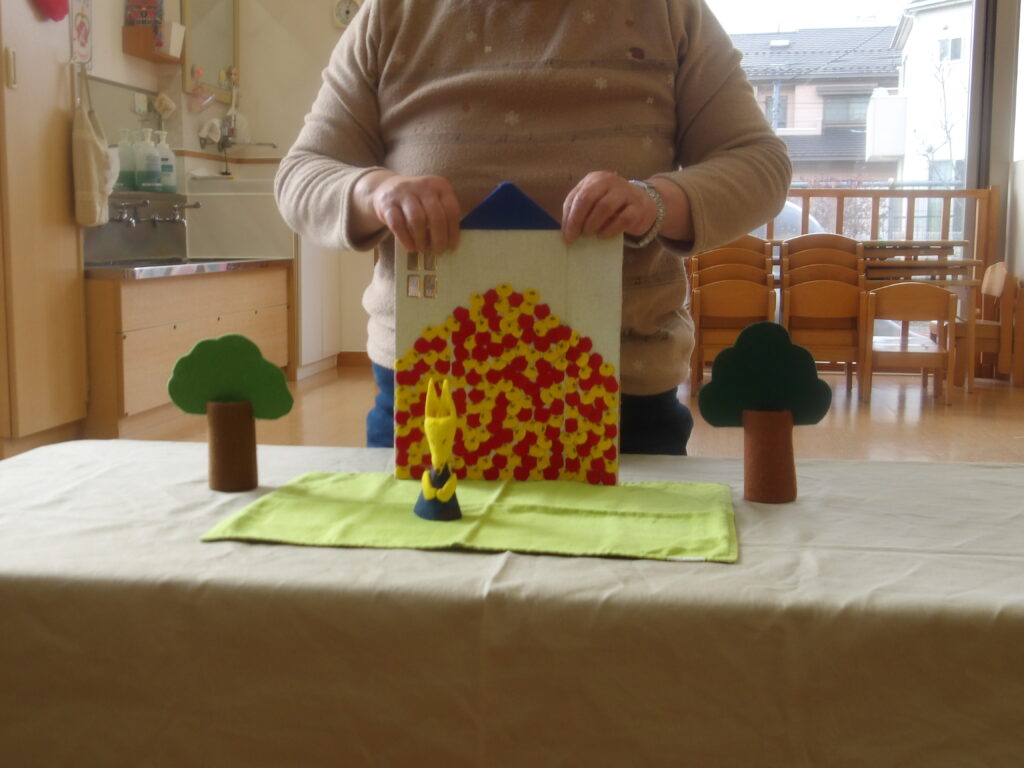小原先生のテーブルシアターは見ていて本当におもしろく子ども達も大喜びで見ていました。キューピーちゃんがお相撲をしたり、お家の中からお家が出てくるお話やきつねさんの追いかけっこのお話といっぱい見せてくれました。