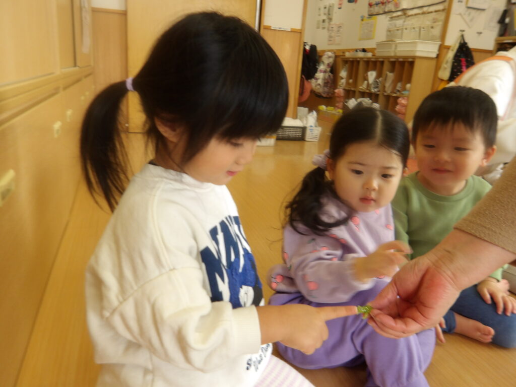 真剣にお話を聞いて参加をしていたにじ組の子ども達、小原先生に体を使ったわらべうたをたくさん教えてもらい、真似をして楽しんでいました。