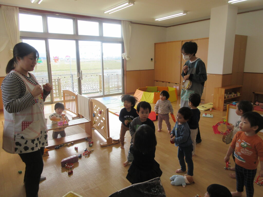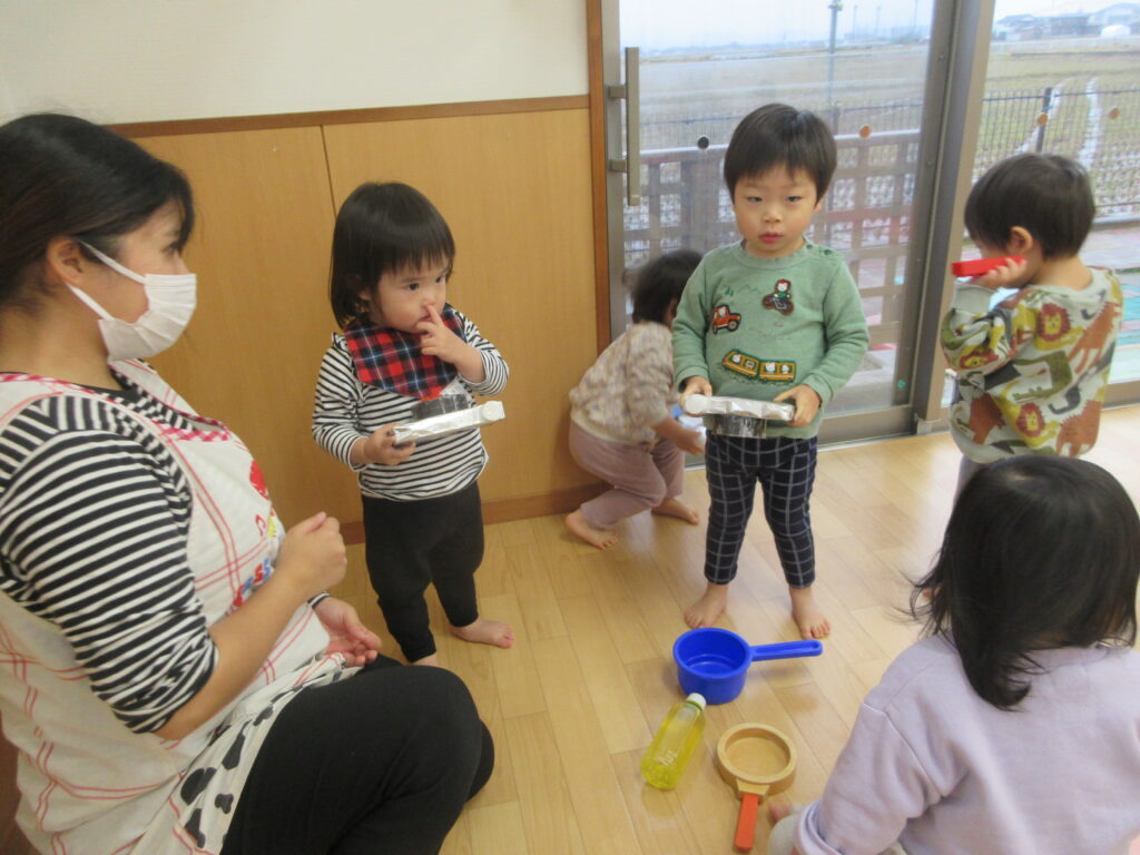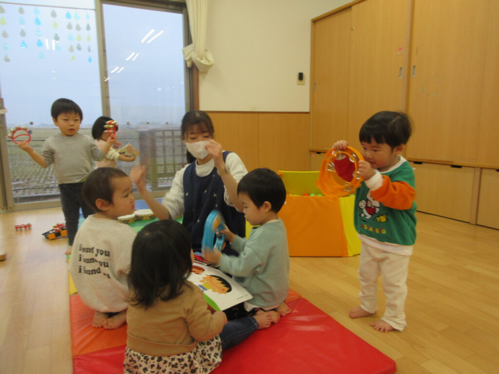 クリスマスの歌から始まりみんなの大好きな曲までたくさん楽器を鳴らしたり、リズムに合わせて身体を動かすことを楽しんでいます。