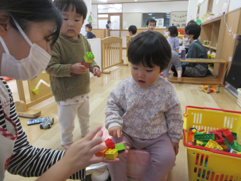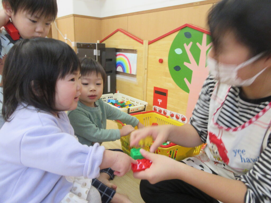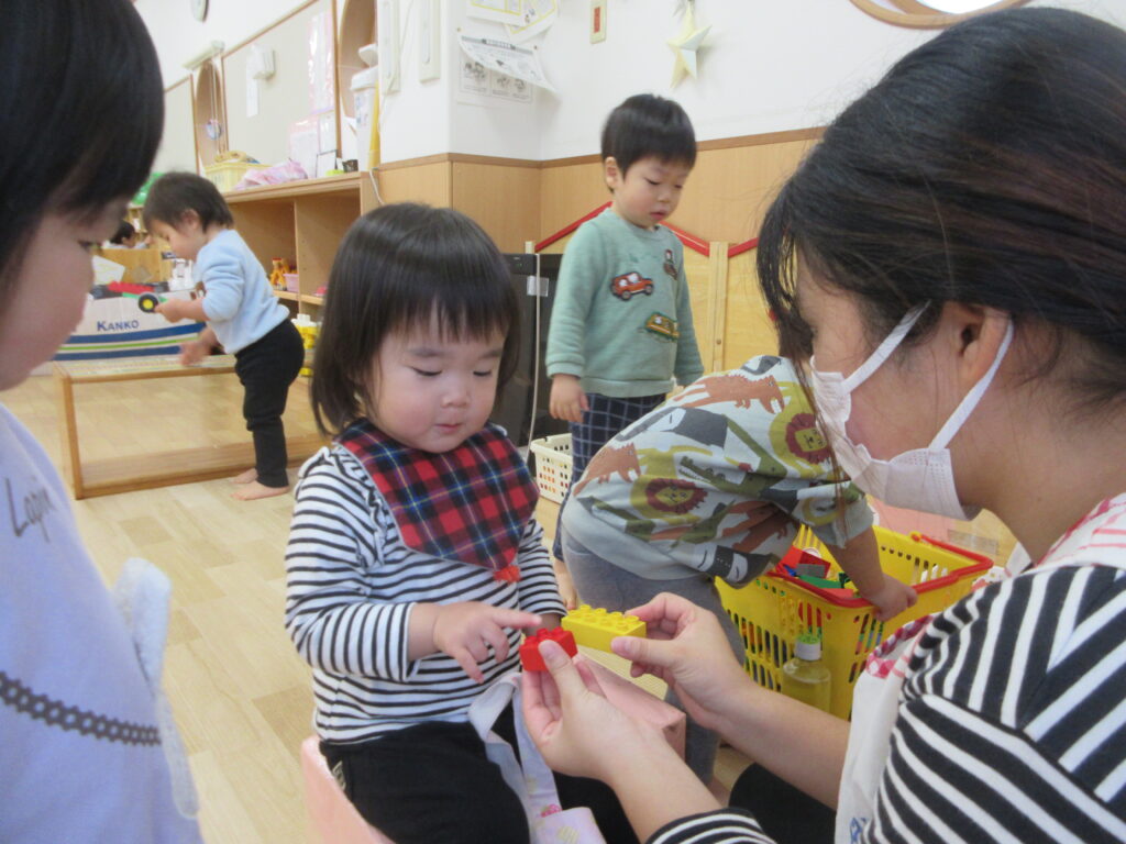 レゴブロックを化粧品に見立て、「ほっぺはどの色にしますか?」と聞くと「あか!」と自分の好きな色を選んでいました。