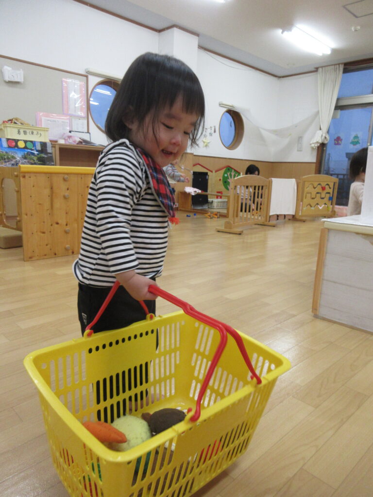 レゴブロックが入っていたカゴがお店にあるカゴに見えたようで「なににしようかな~~~~」とお話ししながらお出かけしていました♡