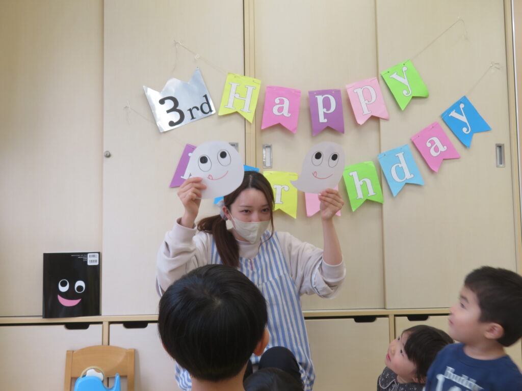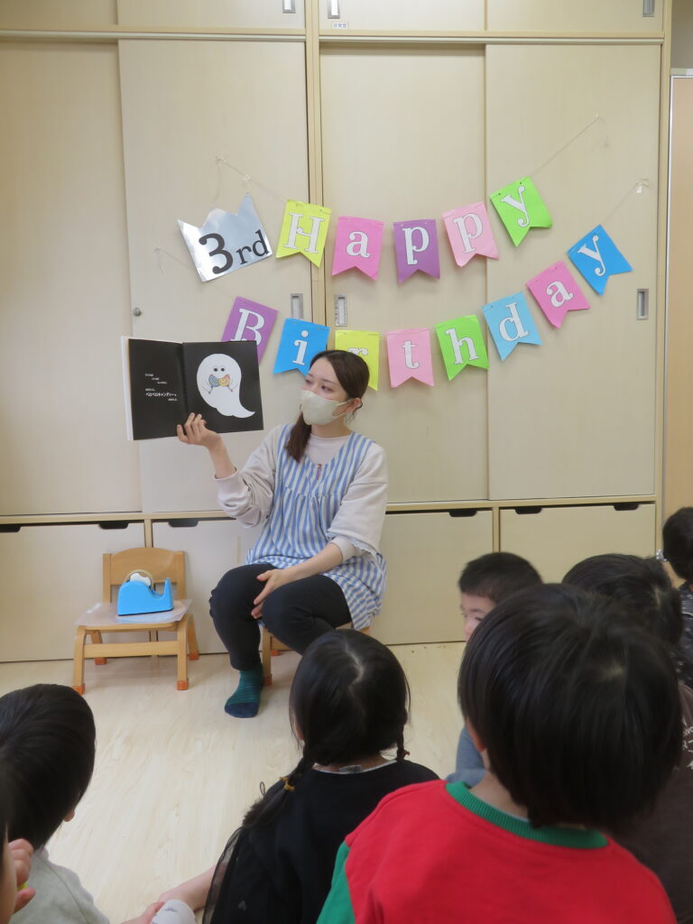 お部屋にもおばけがやってきて、12月生まれのお友達を「ぱくっ」と食べてしまいました。「わ~!」と子どもたちが驚く中、「お誕生日のお友達だ!」と気が付く子もいましたよ。そのまま、12月生まれのお友達の登場です!