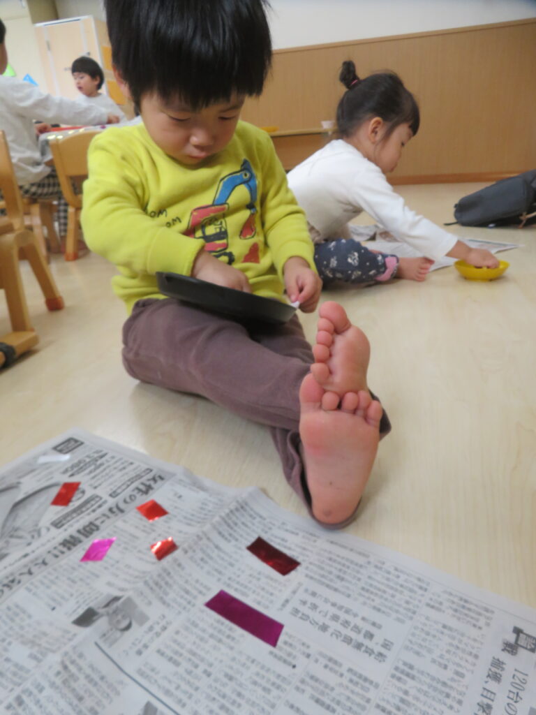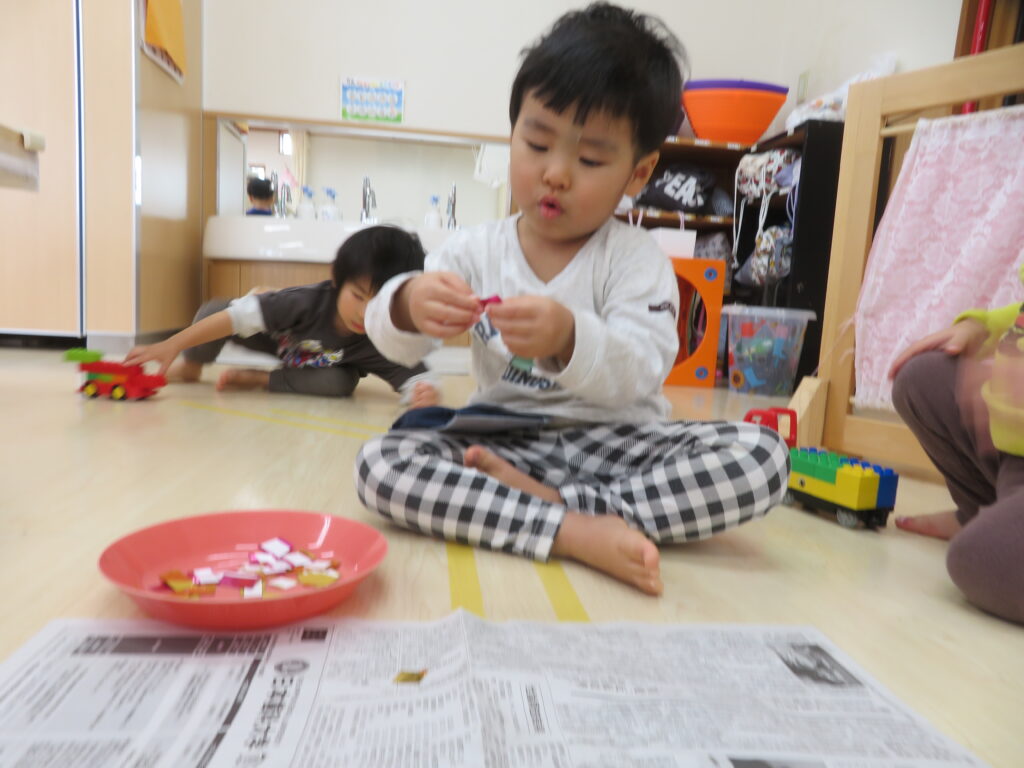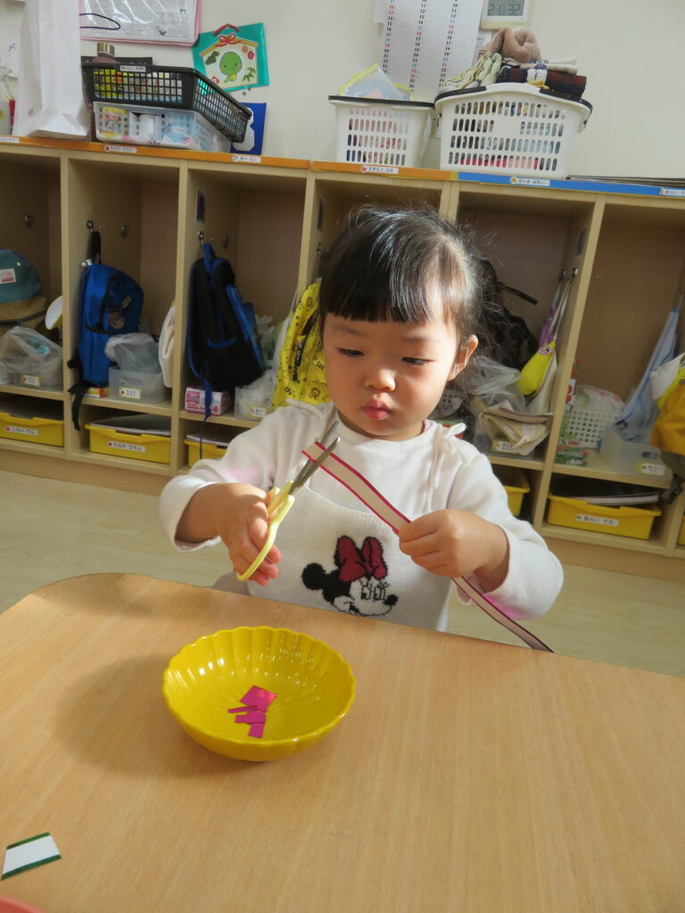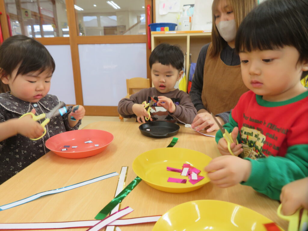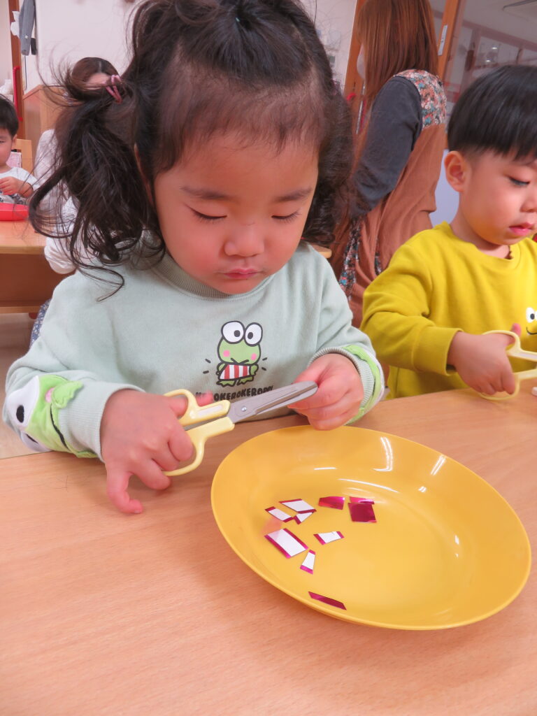 ハサミを使って上手にチョキチョキとキラキラテープを切っていきます。手先が器用になってきて、ハサミを使う活動を取り入れています。今日は「一回切り」の練習です。