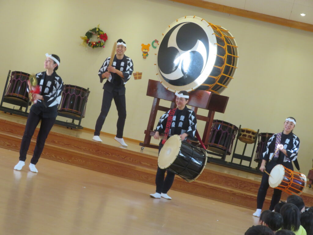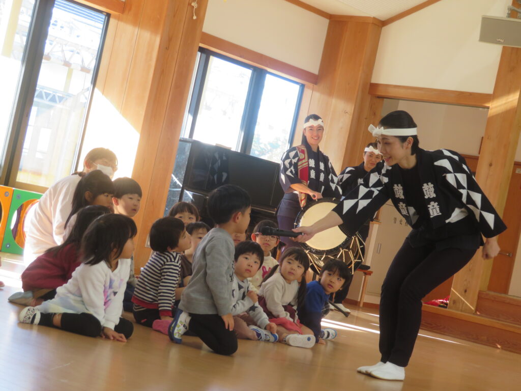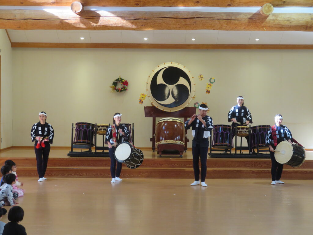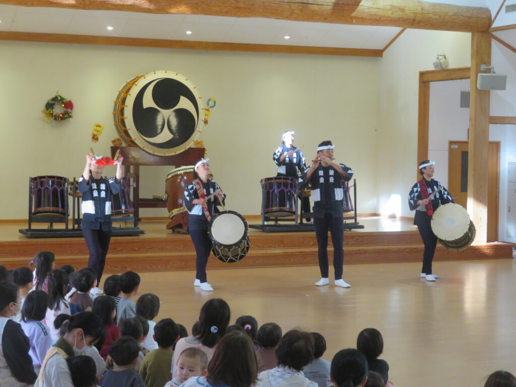 12月19日(金)に鼓童の公演がありました。普段なかなか見ることのない大きな和太鼓に、始まる前から大興奮だった子どもたち。軽やかな和太鼓の音が鳴り始めると、子どもたちの視線は釘付け。小さなお友達もとても集中して見ていました。