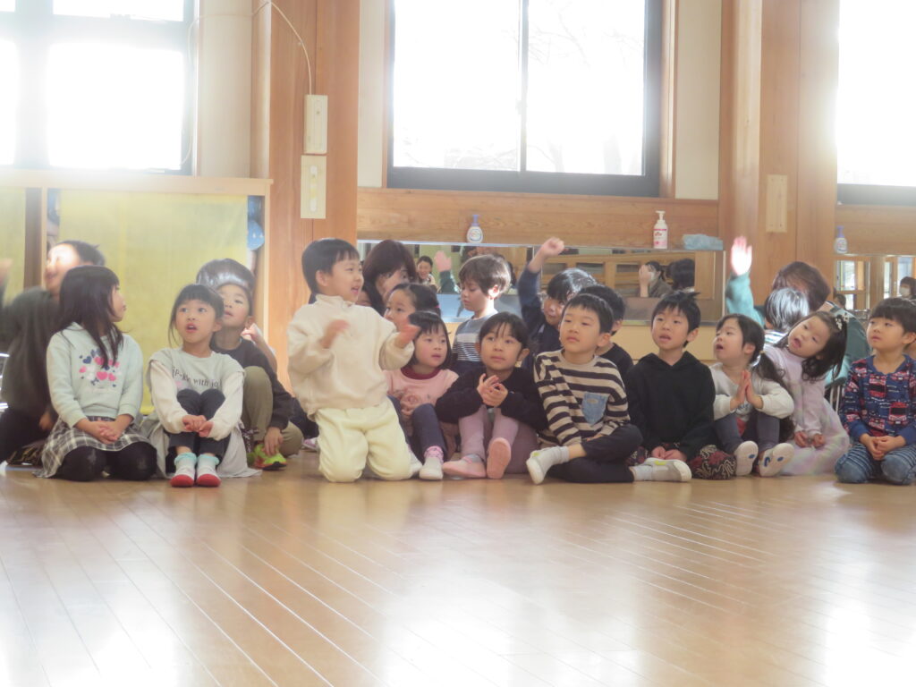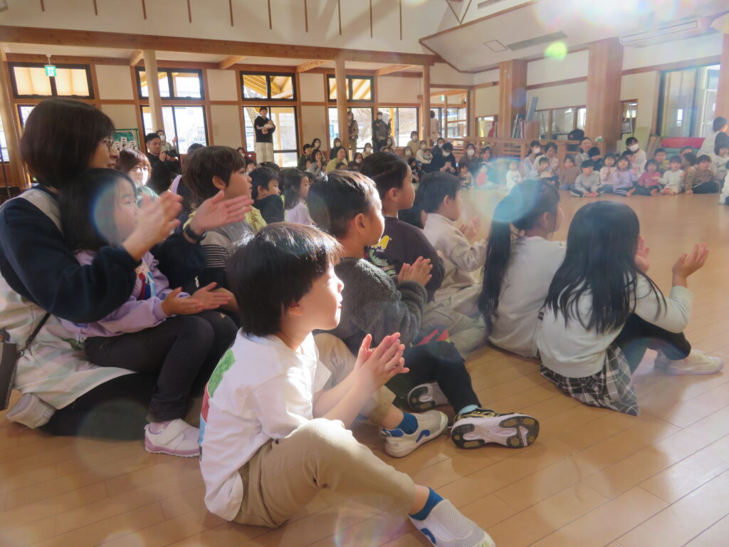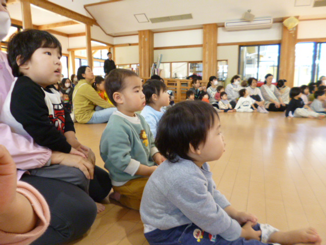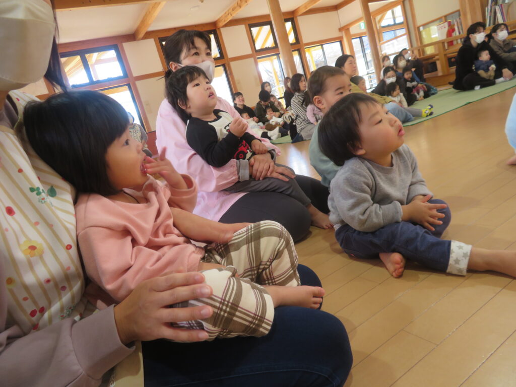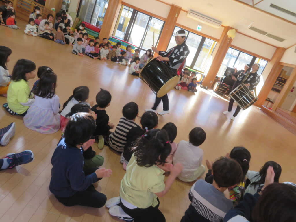 12月19日(金)に鼓童の公演がありました。普段なかなか見ることのない大きな和太鼓に、始まる前から大興奮だった子どもたち。軽やかな和太鼓の音が鳴り始めると、子どもたちの視線は釘付け。小さなお友達もとても集中して見ていました。