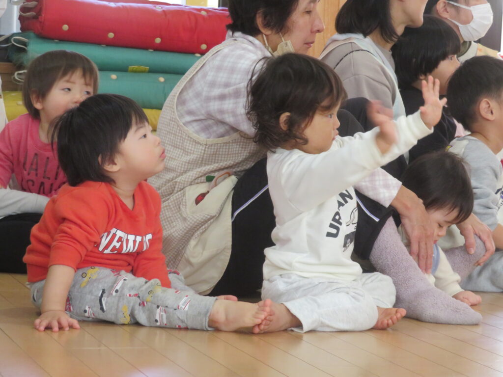 子どもたちの好きな果物を取り入れたリズム遊びもしてくれました。リズムに合わせて手を叩いていると、『ジングルベル』の演奏が始まり、さらに会場は大盛り上がり。みんな楽しんで手拍子で参加していました。