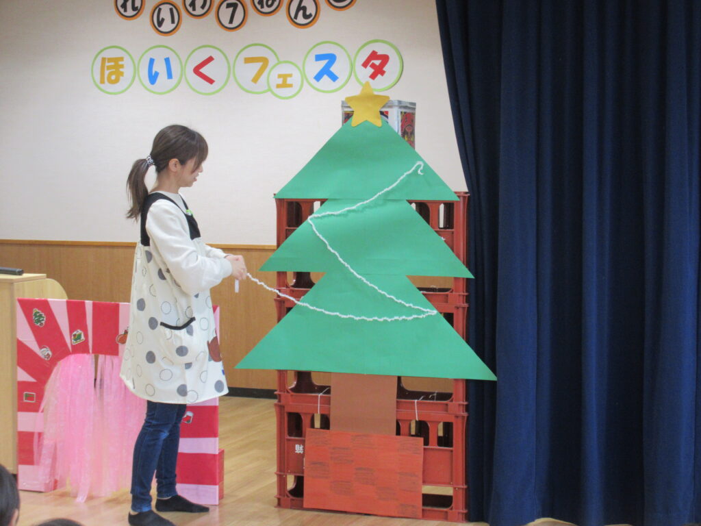 次は時計が登場🕰️「とけい、とけい・・・」と言いながらトンネルを通ると・・・”毛糸”に変身😮変身した毛糸でクリスマスツリーを飾りつけ。でもまだまだ寂しいクリスマスツリー。そこで・・・
