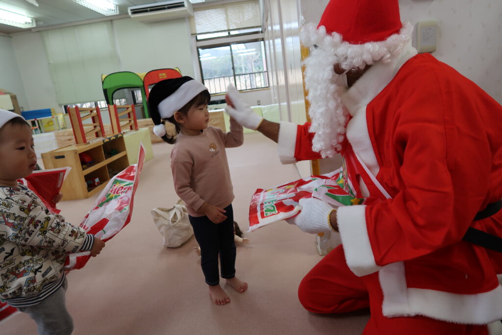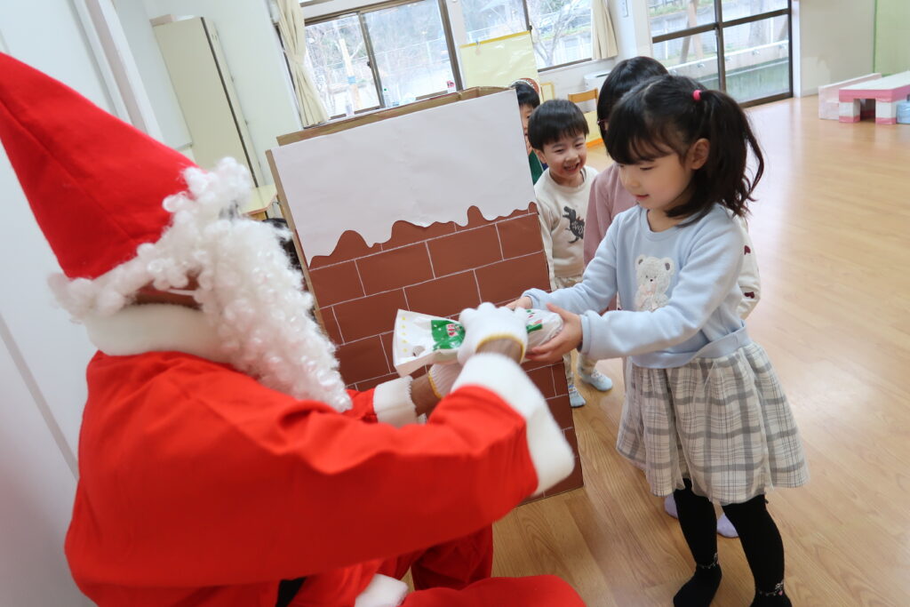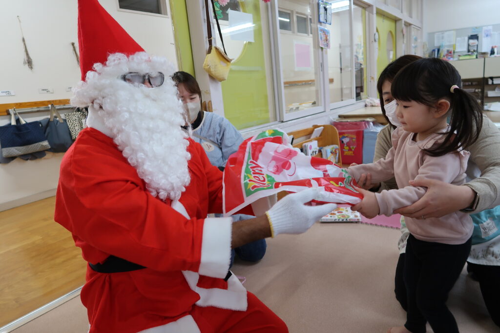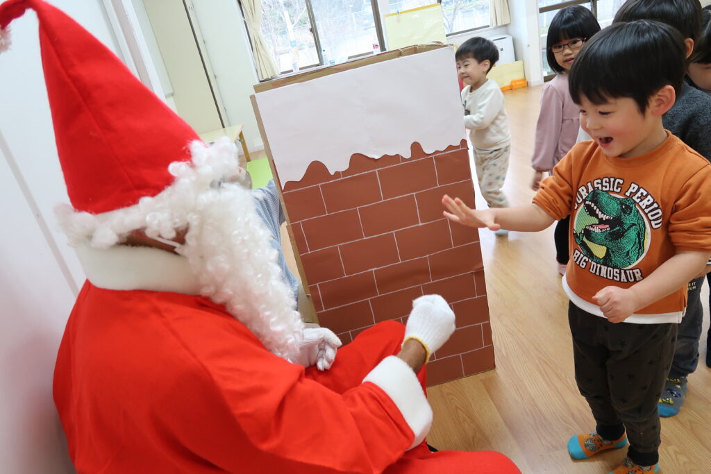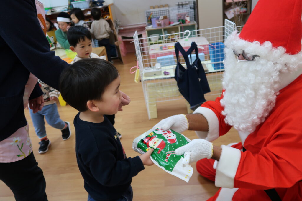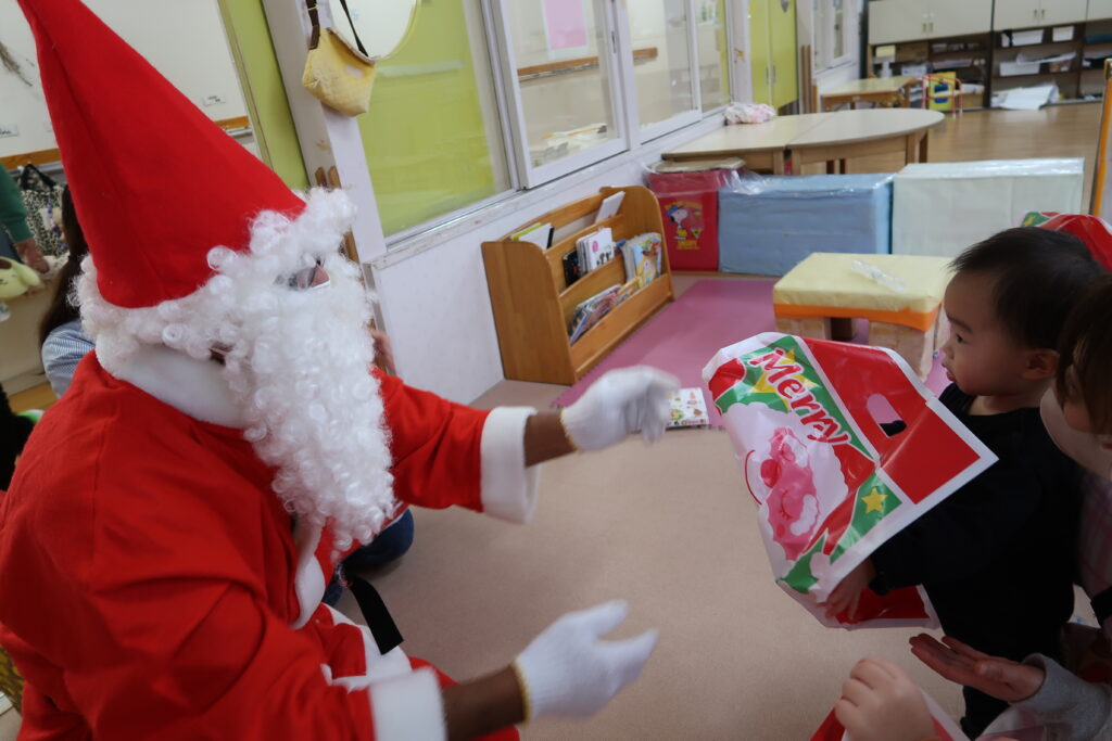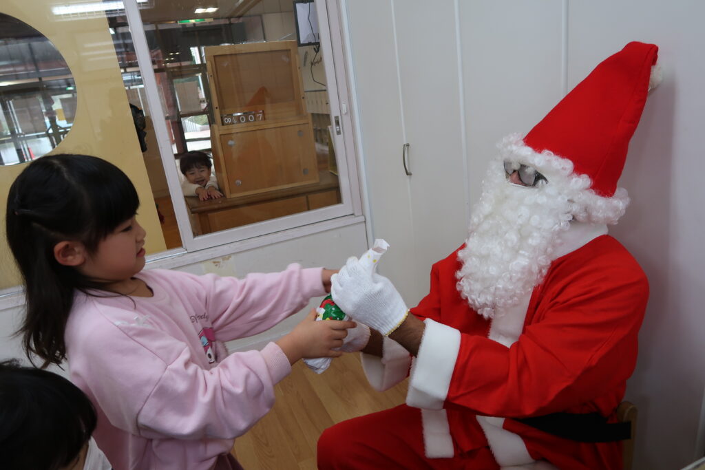 お部屋からサンタさんの赤い服が見えると「サンタさんじゃない?」とワクワクが止まらない様子の子どもたち。「どこから来たんだろうね」とお友だち同士でお話をする姿も見られました。サンタさんとじゃんけんをしてからプレゼントをもらったり、「メリークリスマス!」と元気よく言ってサンタさんとの触れ合いを楽しんでいました。