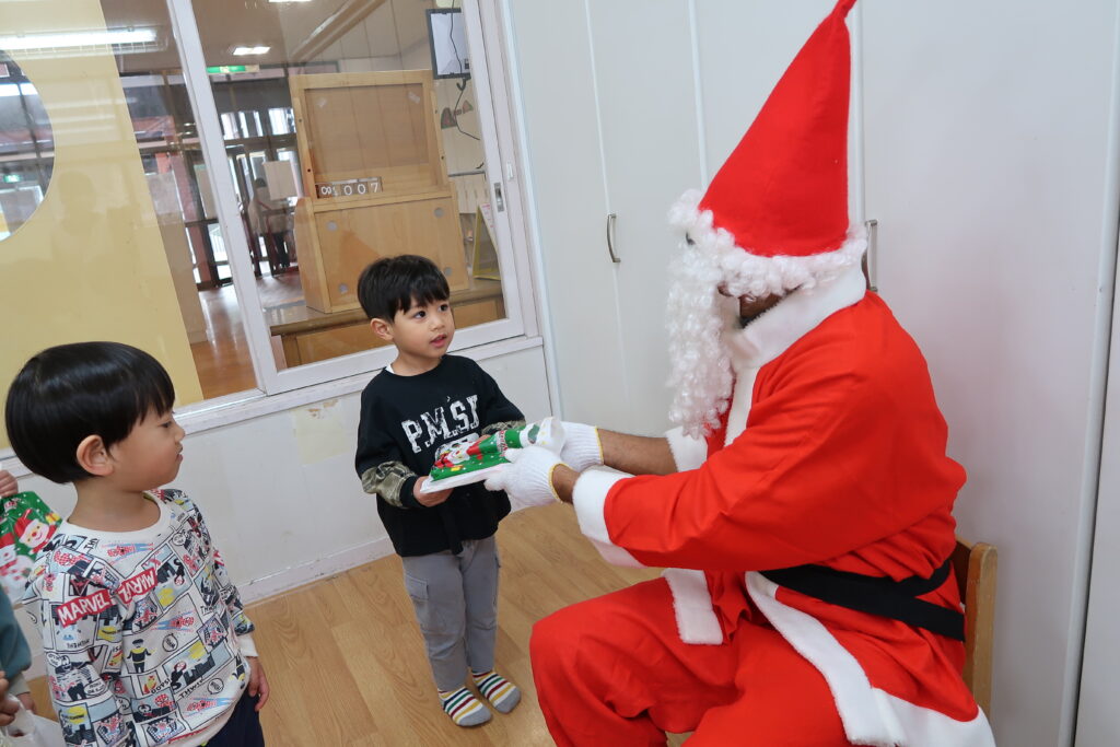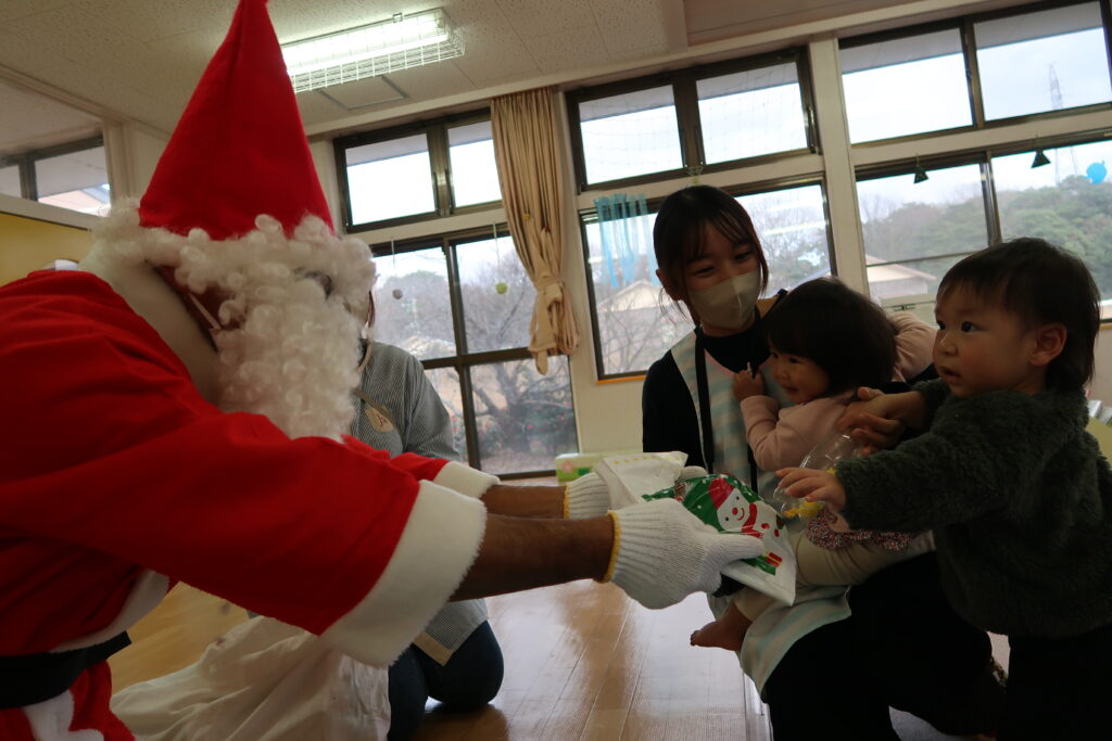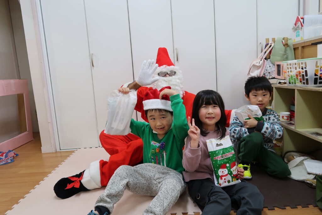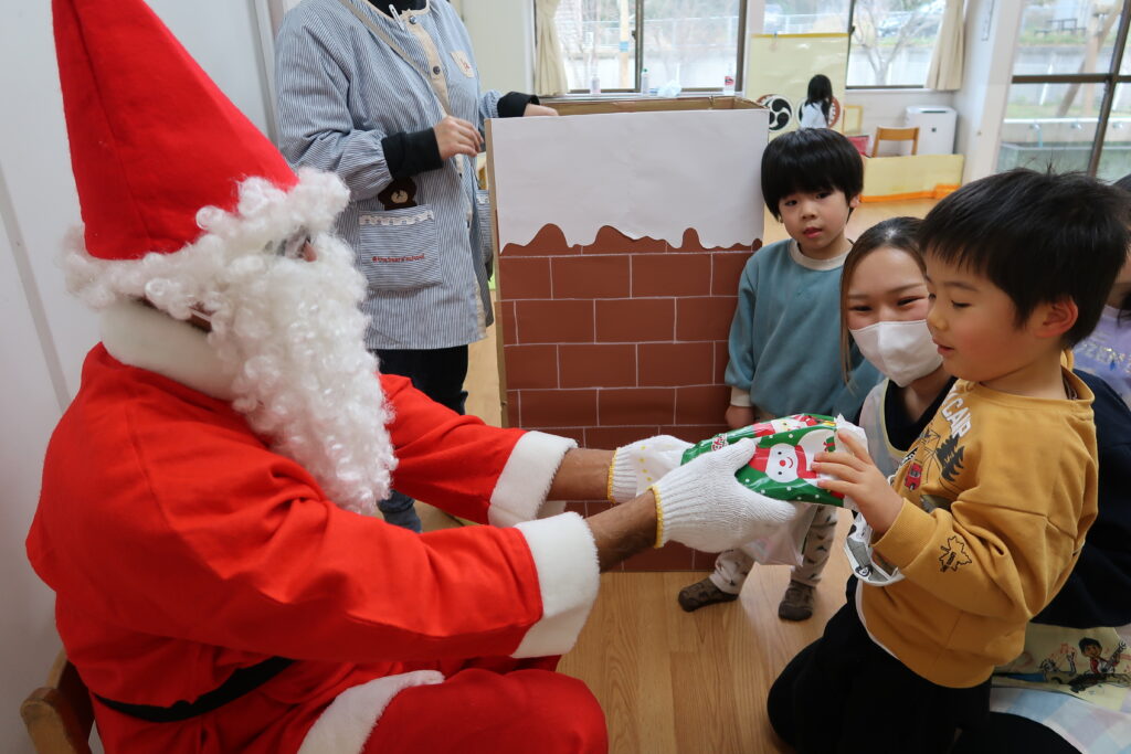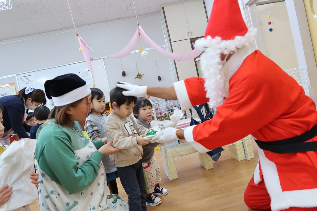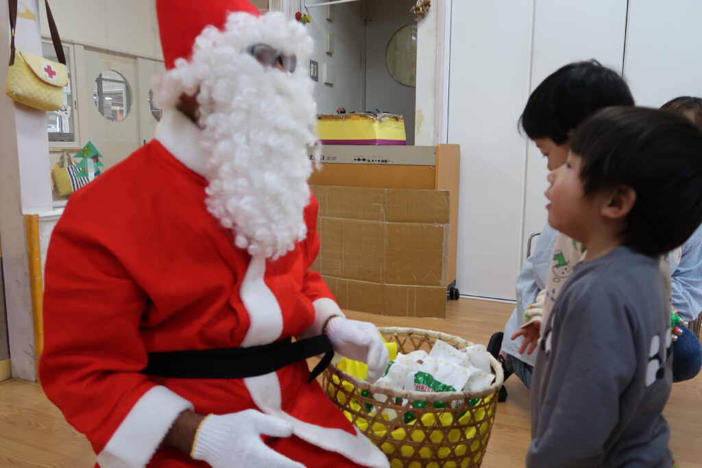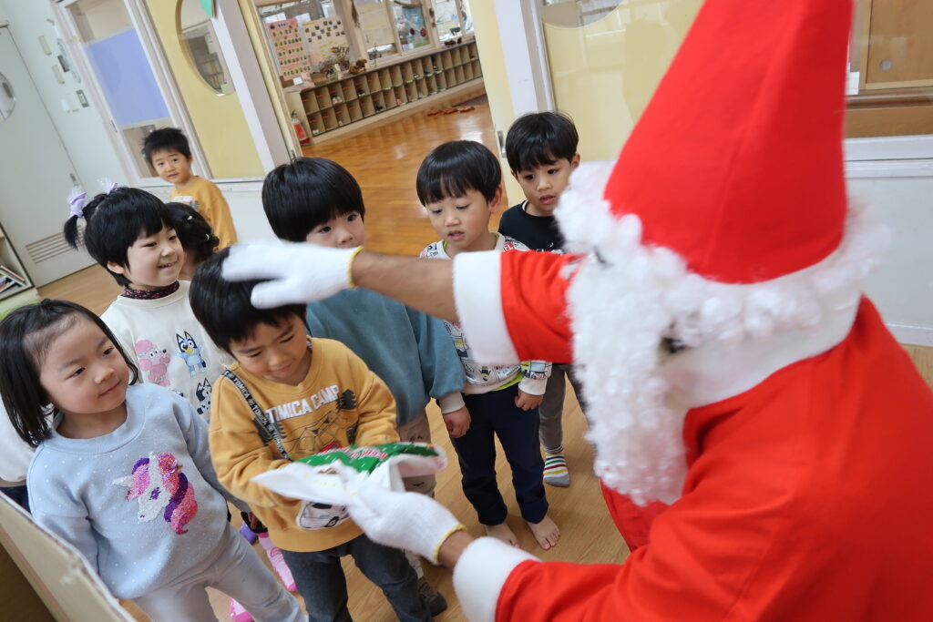 お部屋からサンタさんの赤い服が見えると「サンタさんじゃない?」とワクワクが止まらない様子の子どもたち。「どこから来たんだろうね」とお友だち同士でお話をする姿も見られました。サンタさんとじゃんけんをしてからプレゼントをもらったり、「メリークリスマス!」と元気よく言ってサンタさんとの触れ合いを楽しんでいました。