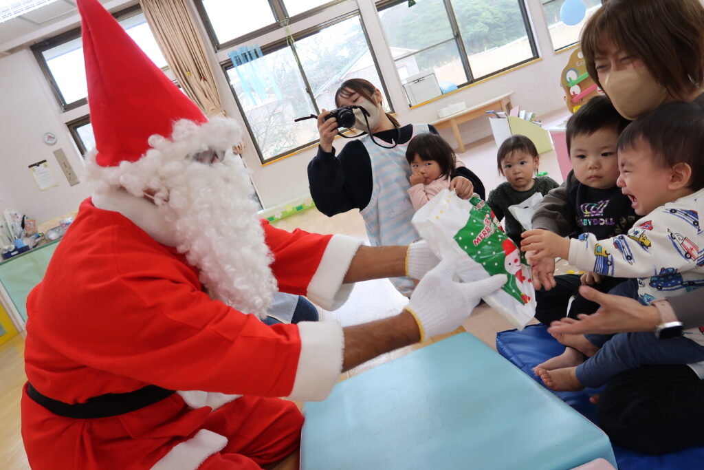 サンタさんがお部屋に入ってくると驚いたようで泣いてしまった子どもたち。プレゼントをもらう時にはそっと手を伸ばして受け取っていました。サンタさんとハイタッチをしたり、「ありがとう」とお礼を言う子どもたちもいました!