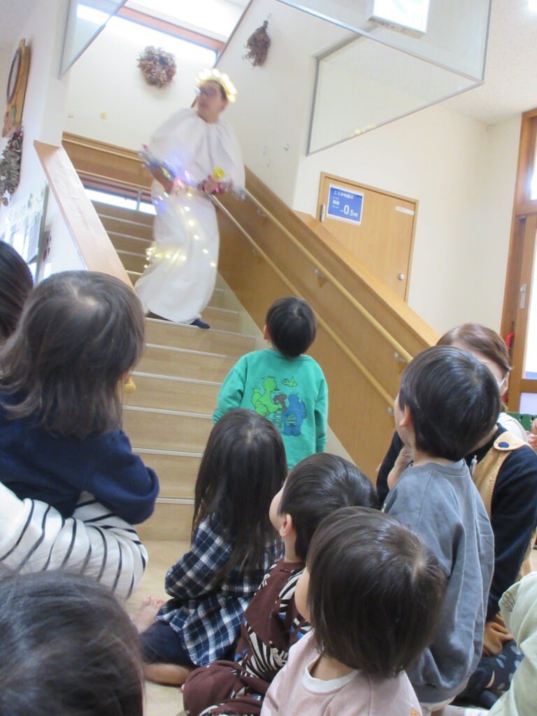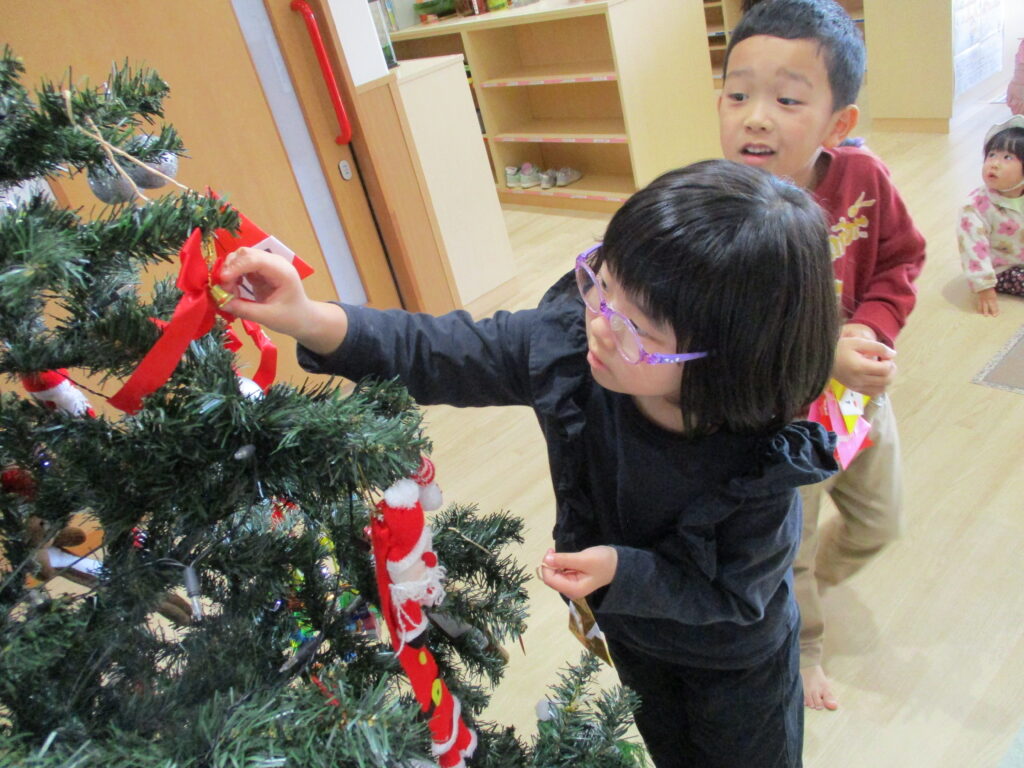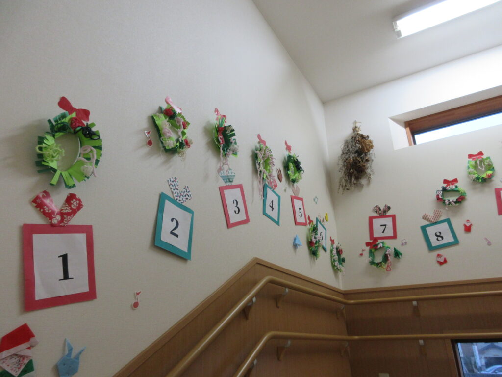階段のアドベントカレンダーと一緒に作ったリースを飾ったりと、子どもたちのわくわくした気持ちとともに、園内はクリスマスの雰囲気で盛り上がりました!