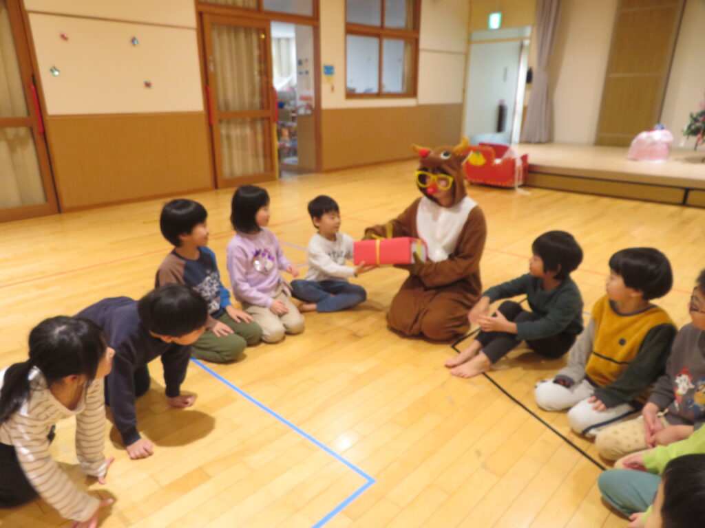 キャンドルサービスの後、鈴の音が聞こえ、みんながお待ちかねのサンタさんと相棒のトナカイさんが登場!