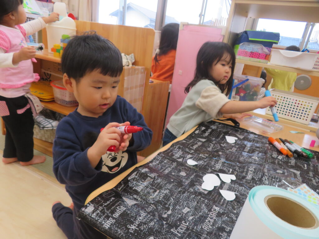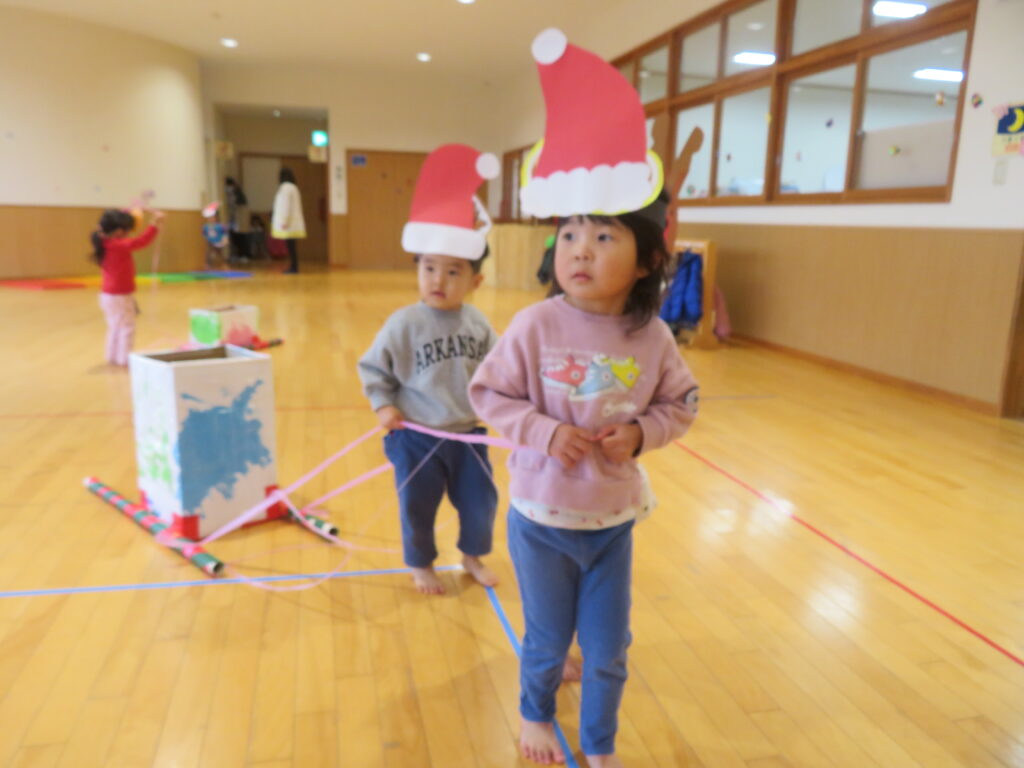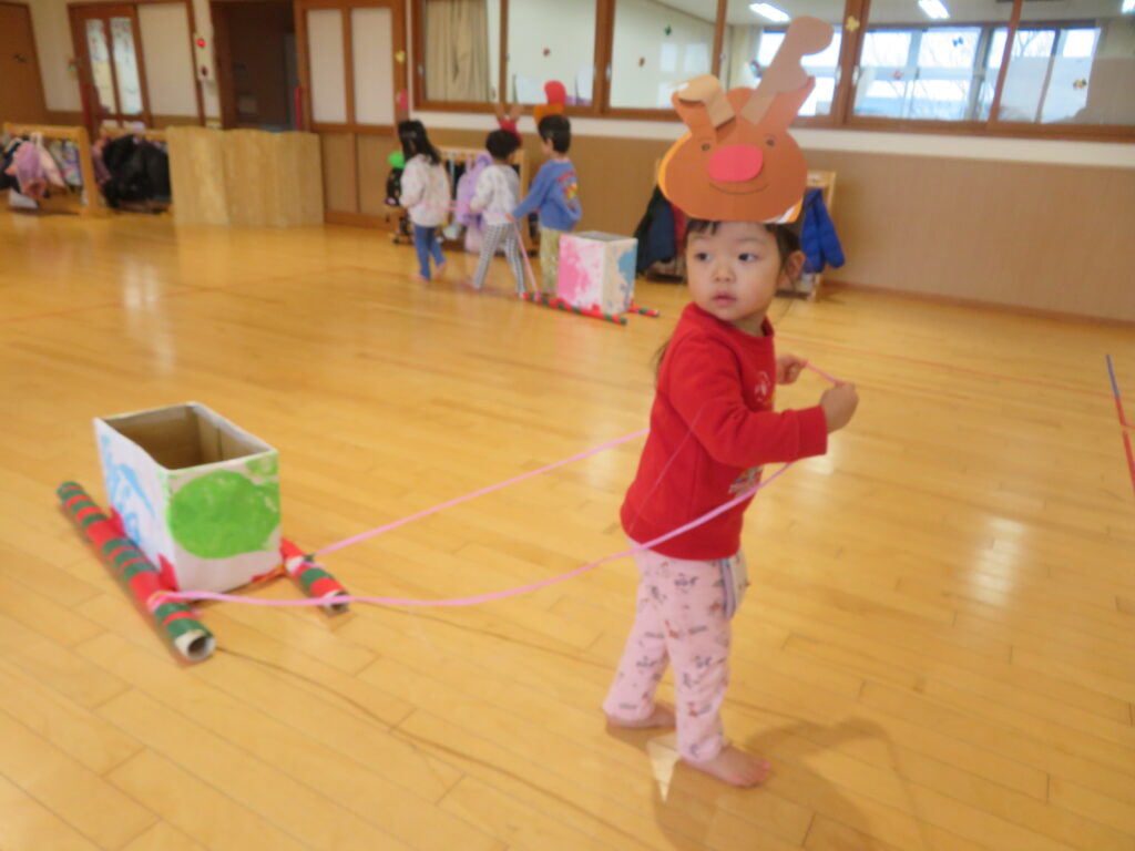 そりを作って中におままごとの料理など自分のプレゼントしたいものを入れてお友だちと色んな保育室を回りにいきましたよ。