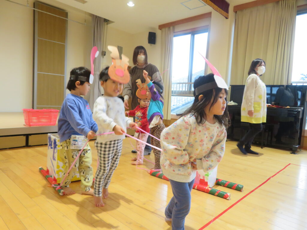 ホールでそりを使ってゲームを楽しみました。一人で引っ張る事も好きですが、お友だちと一緒に引っ張ることもとても好きで友だちと誘い合って楽しんでいましたよ。