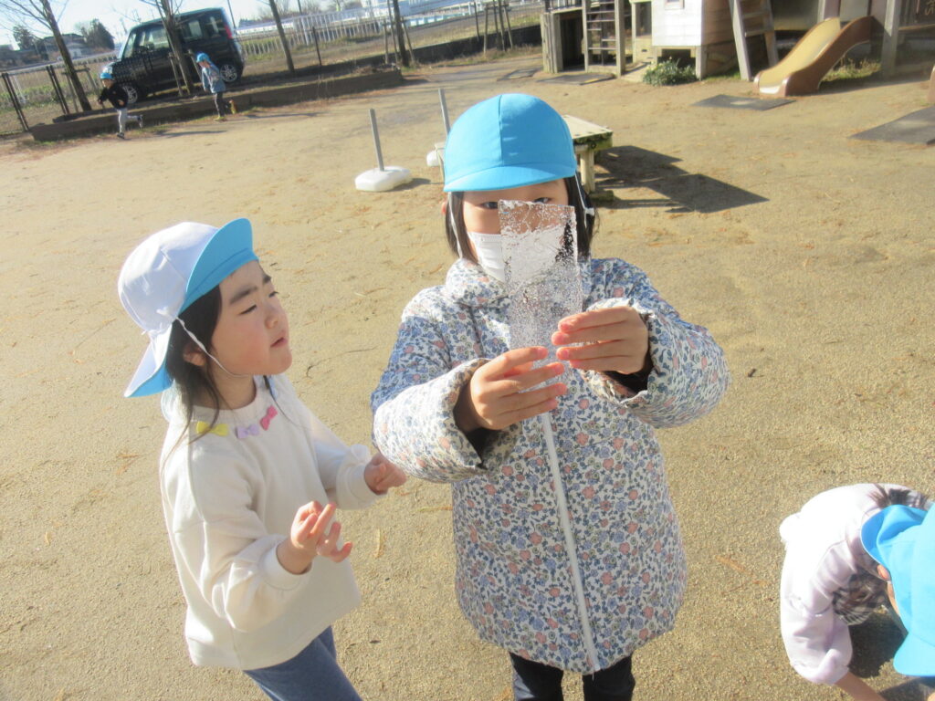 氷が張っている日は園庭にある水たまりや池をくまなくチェックします🐻