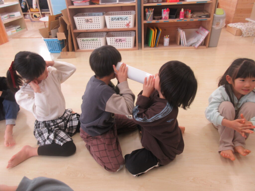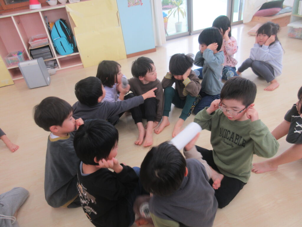 伝言ゲームでは友だちの耳を気遣いながら、声量は控えめに、でも確実に伝えることが出来るように繰り返し楽しんでいます。この日は初めて最後まで伝言をすることが出来た記念すべき瞬間です😊
