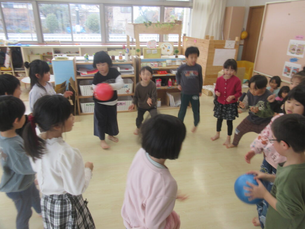 こちらはばくだん渡しゲーム💣 音楽が流れたら隣の友だちにボールを順番に回します。音楽が止まった時にボールを持っていた友だちは『ドカ~~~~~~ン!!!』とリタイアとなります!!ちなみにこの『ドカ~~~~~~ン!!!』もしっかりと言います😁