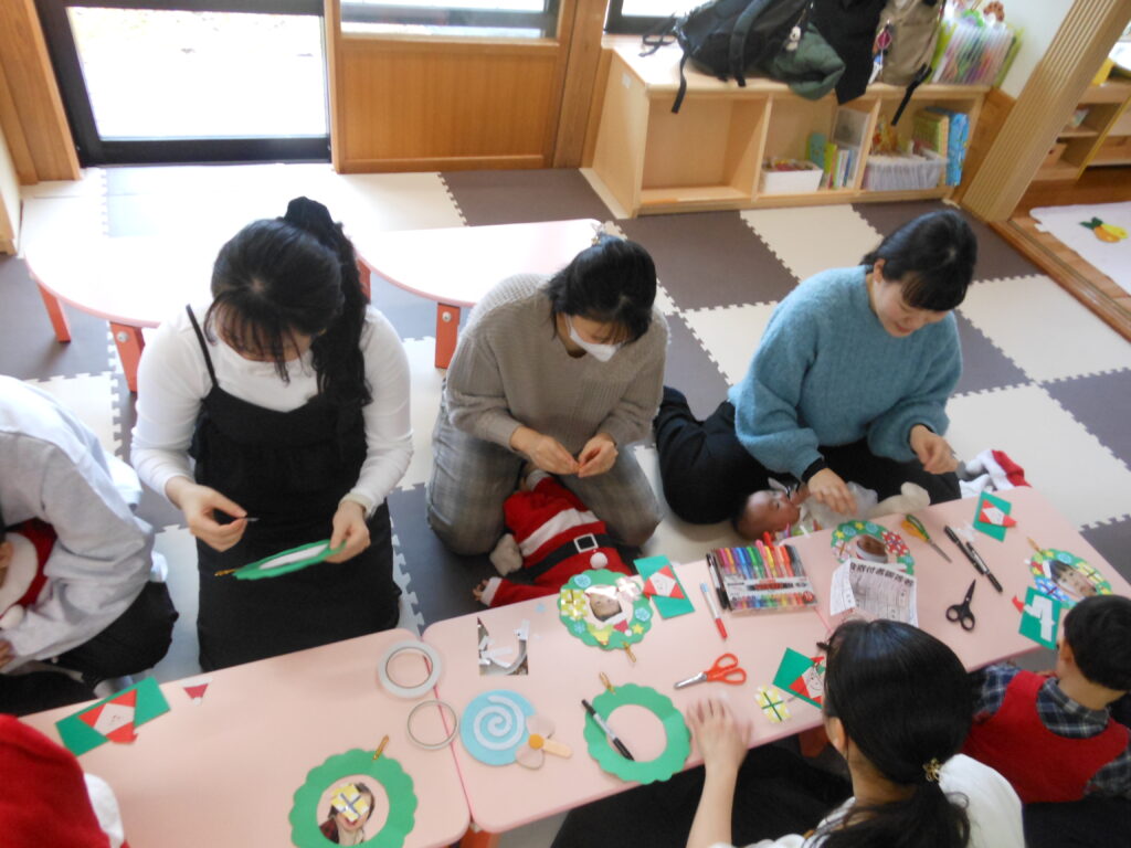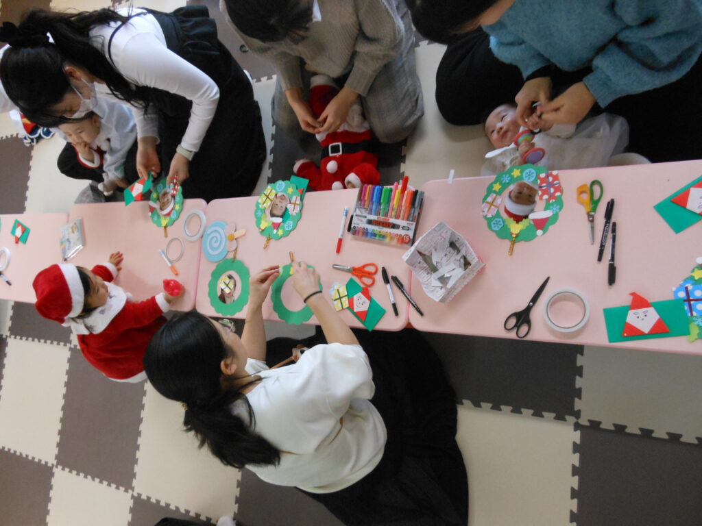 職員の出し物「プレゼントが・・・」を楽しんだ後は、クリスマスリース作り🎅