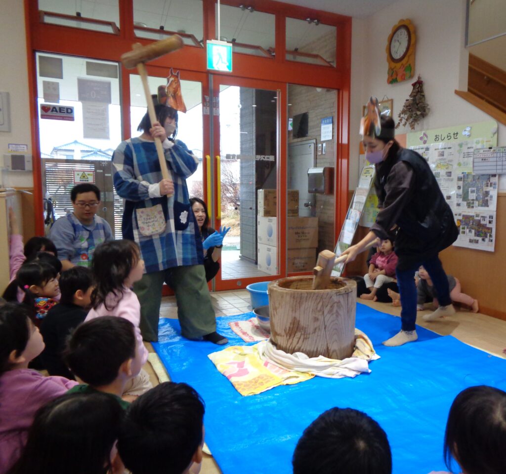 臼と杵の道具のお話や、なぜ鏡餅を飾るのかなどお子どもたちにお話をしたり、「もちつき」の手遊び歌をしたりしていると・・・