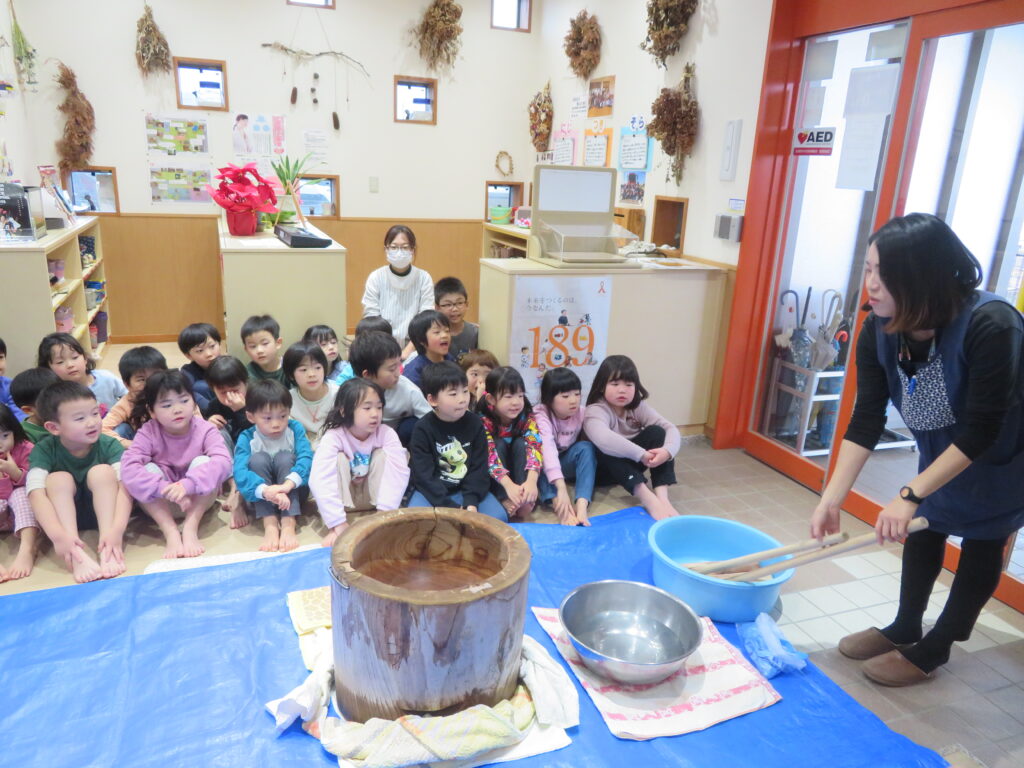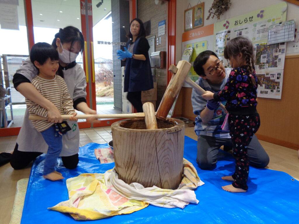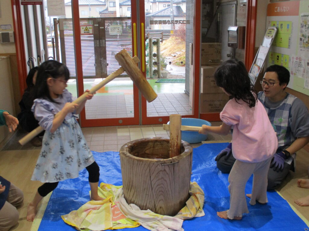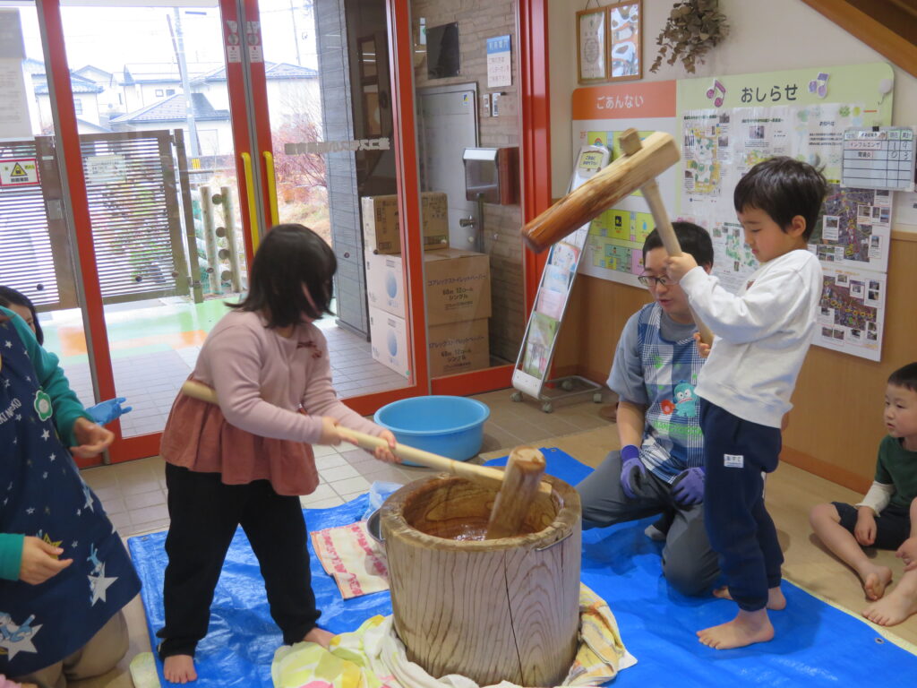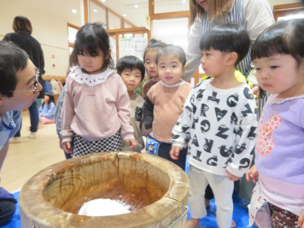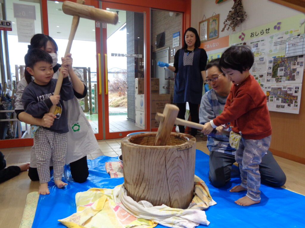 にじ組のお友だちも餅つきにチャレンジしましたよ!