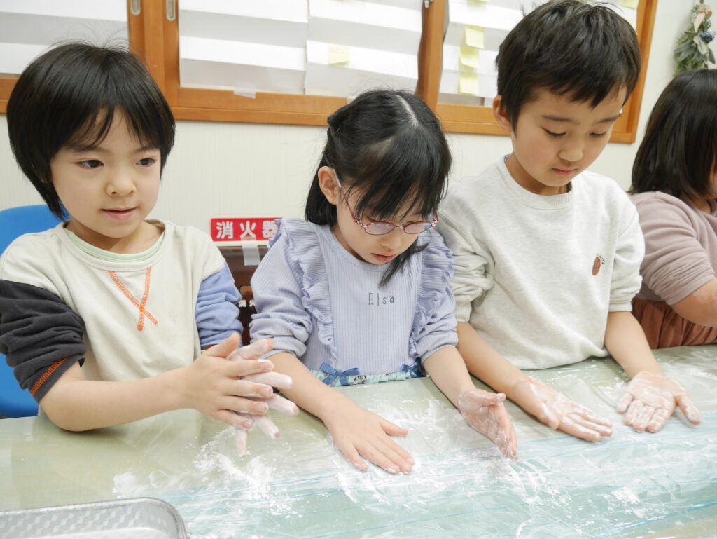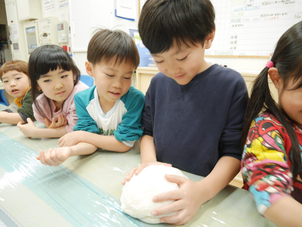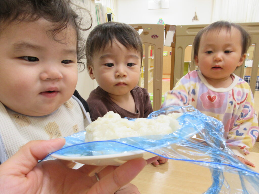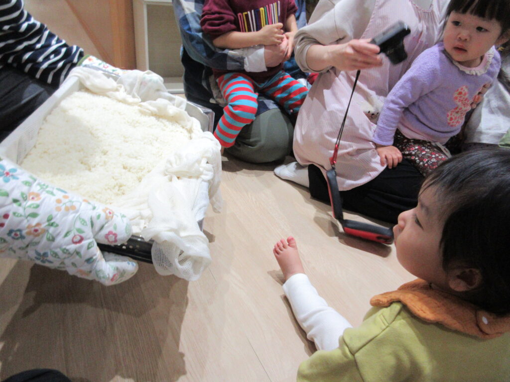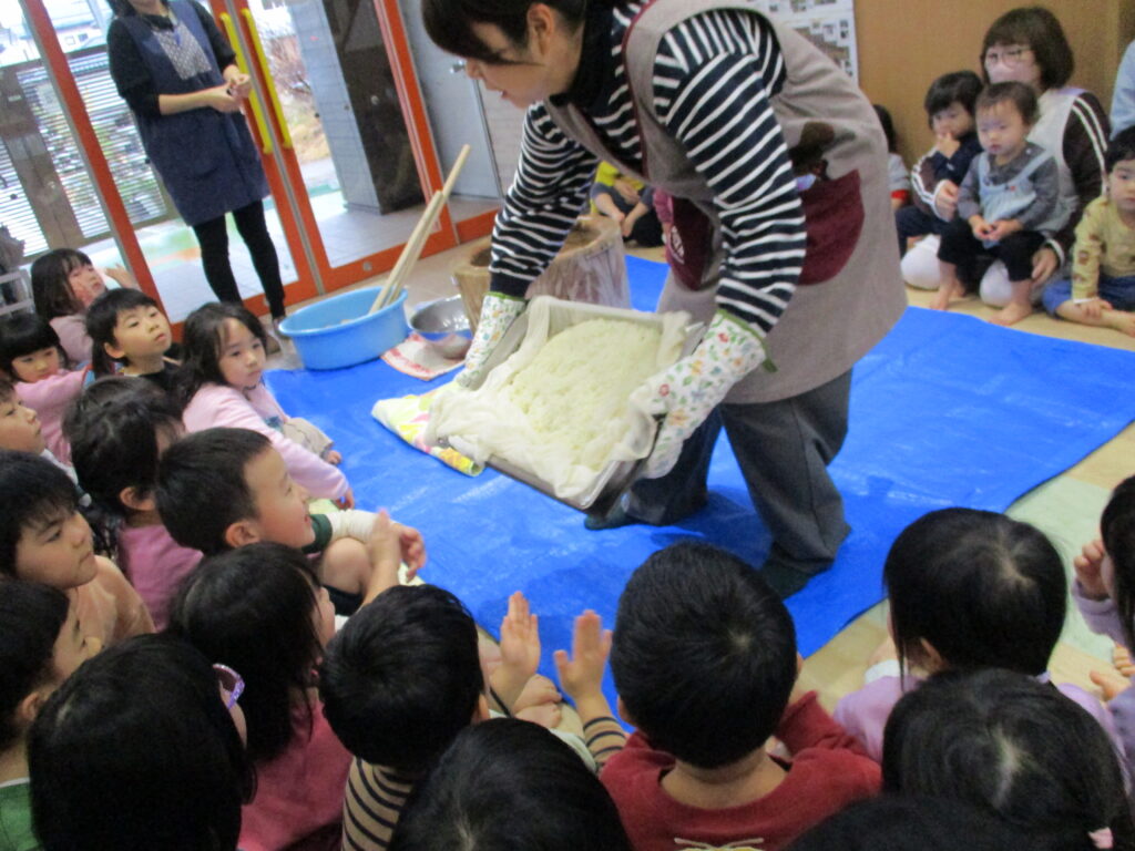 おひさま組のお友だちは、近くでお餅が伸びるところを見て、「すごーい♪」と言って喜んでいました。