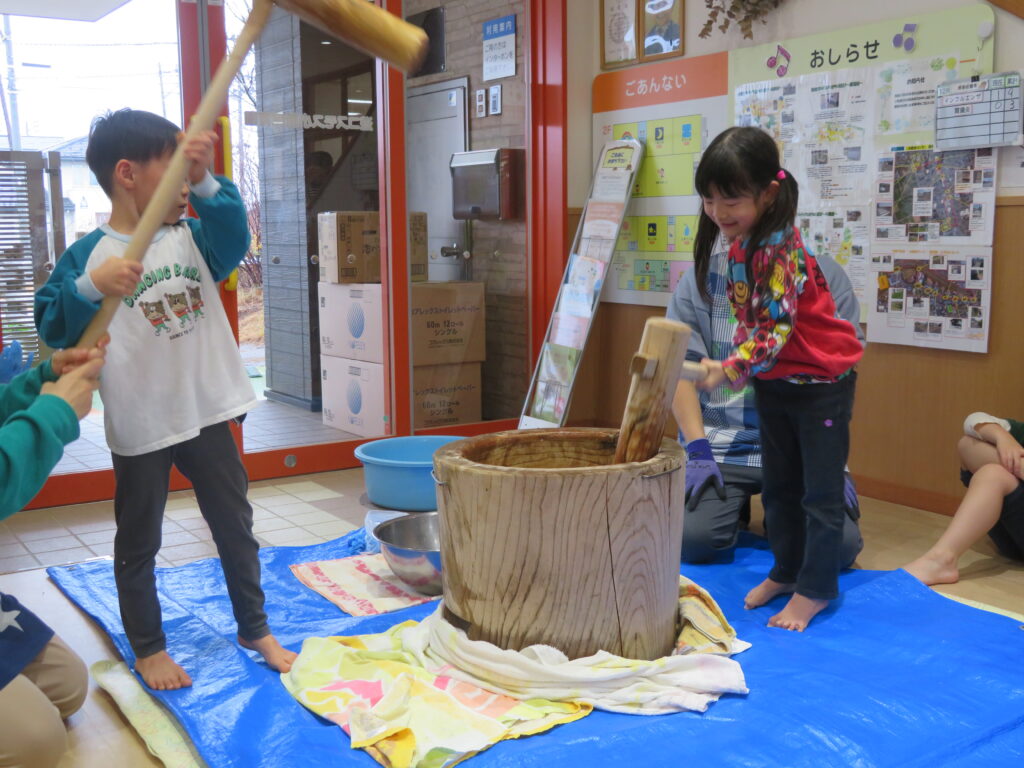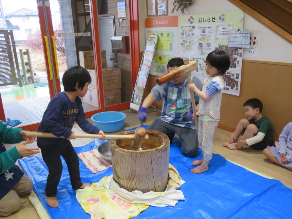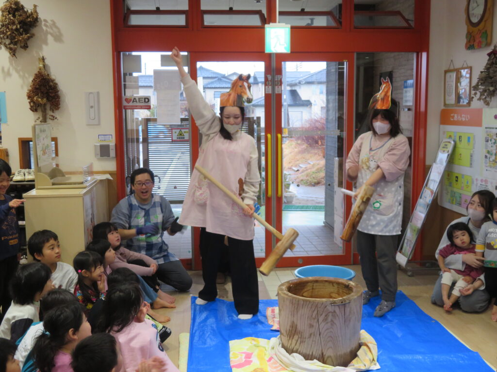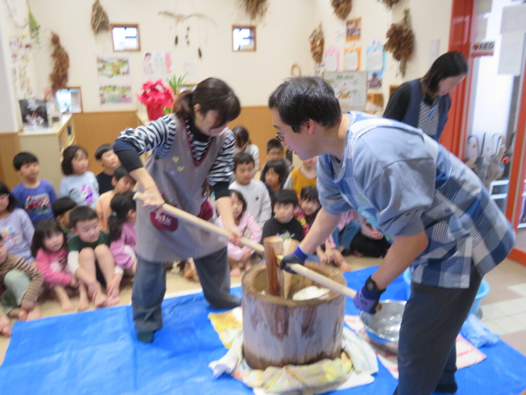 そら組のお友だちは、小学校で頑張りたいことを発表して餅つきをしました!
