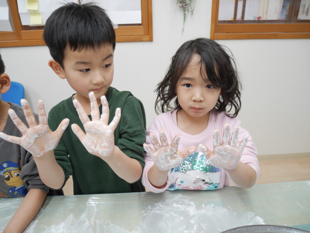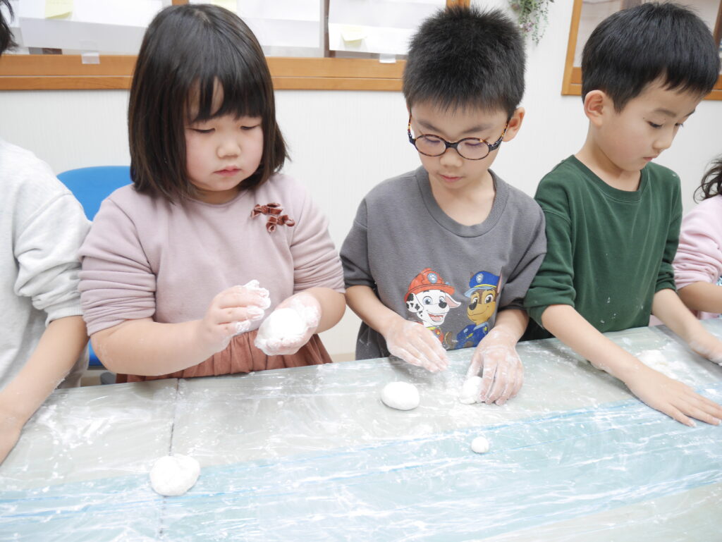 魔法の粉(片栗粉)をつけて、お餅を丸くしていきます。