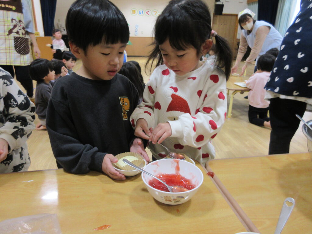 わかば組の子どもは、自分で盛り付けるということが新鮮で嬉しかったようで‟うわぁ~✨”と目を輝かせながらトッピングを盛り付けていました。おままごとが大好きな子どもたちなので楽しかっただろうなぁと写真を見返して思います。