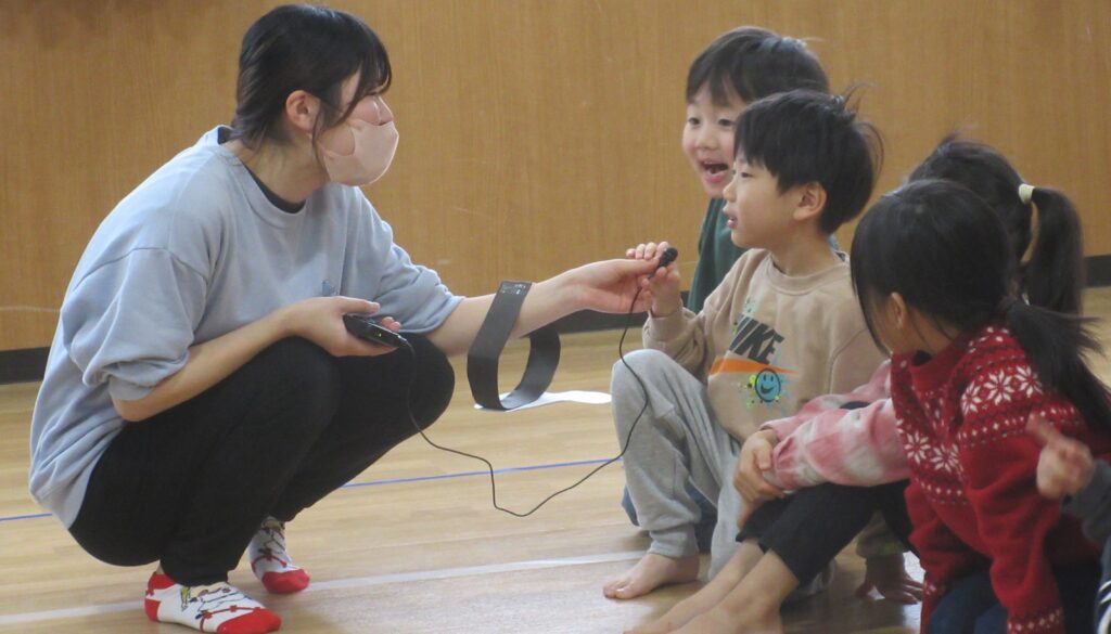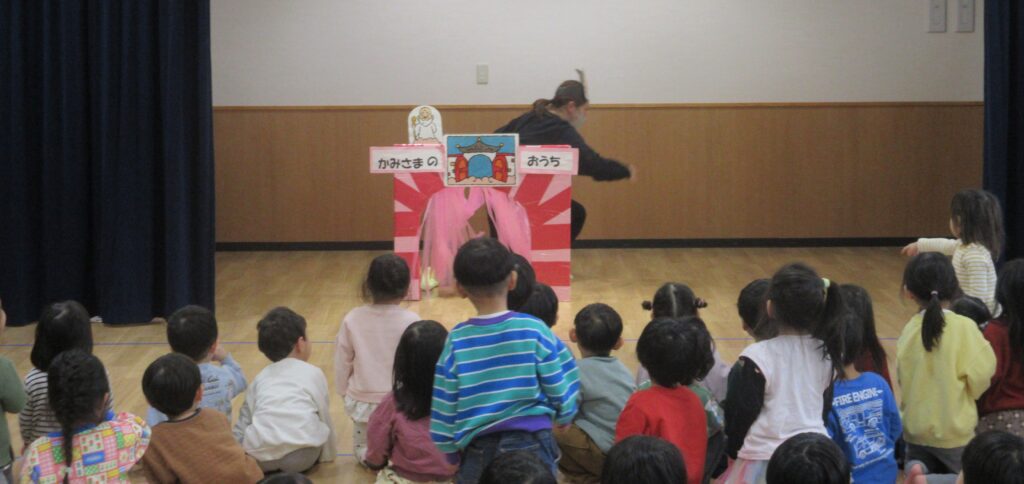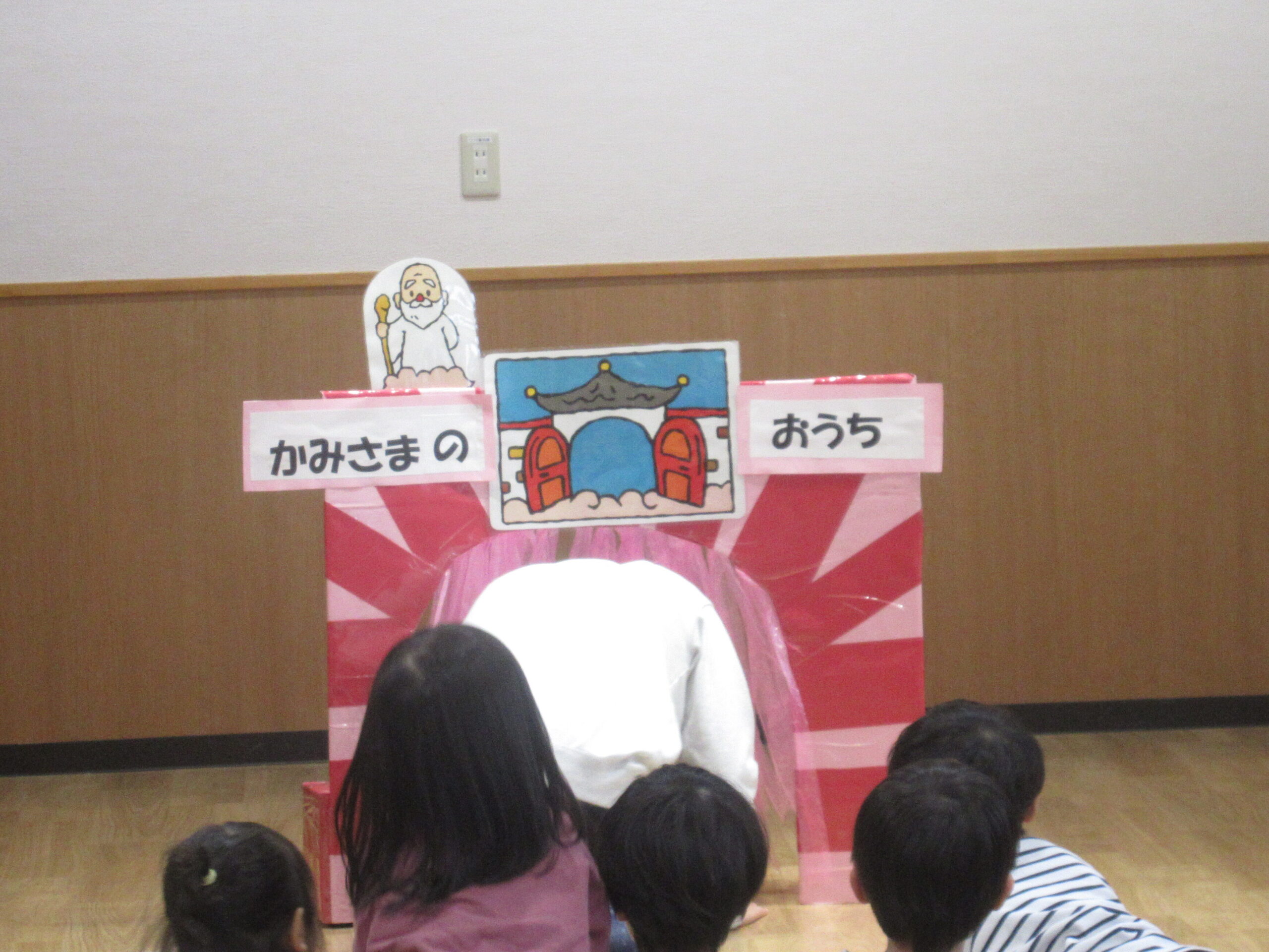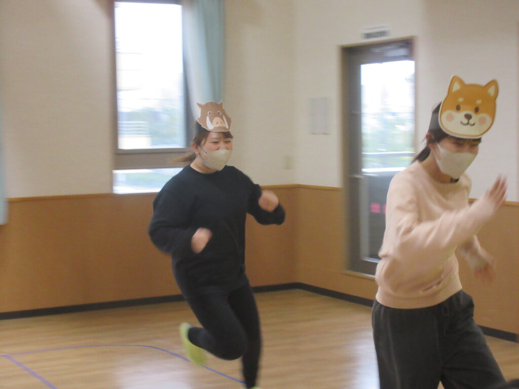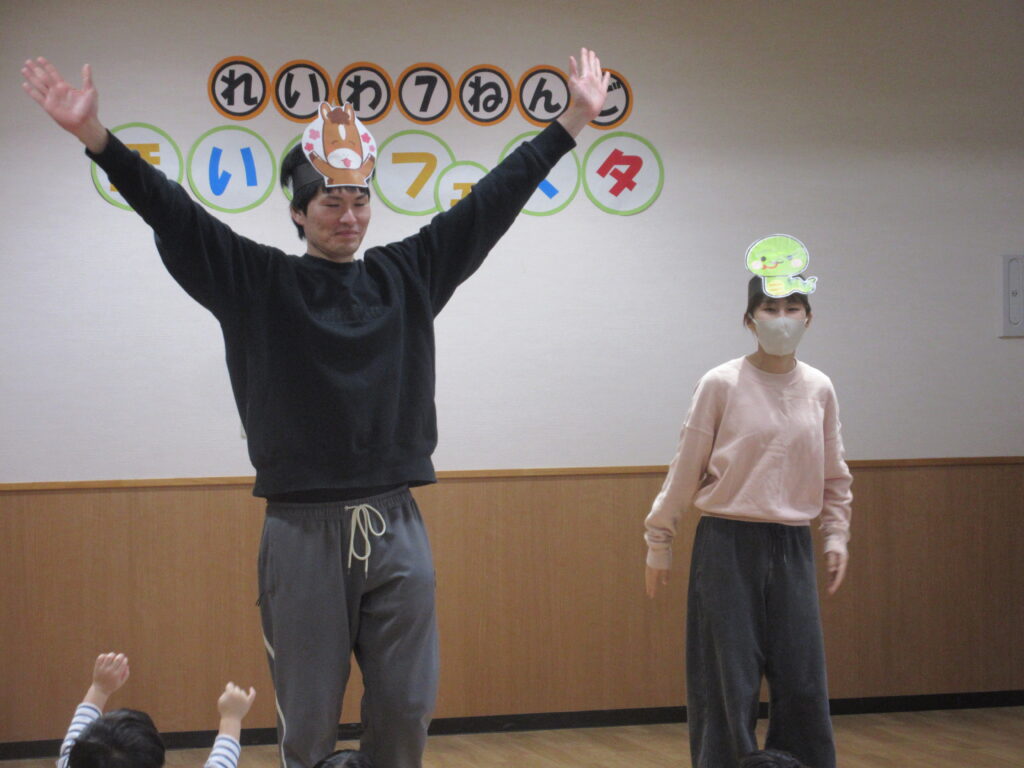 新年といえば、十二支ですね。そこで先生たちによる動物劇場を開催しました。動物たちが神様のお家に集まるため、遊戯室を走って、順番に動物たちがお家の中に入っていくという内容です。そして、ねこだけがねずみに騙されて入ることができませんでした。これには子どもたちもあれ?なんでだろうとザワザワしていました。